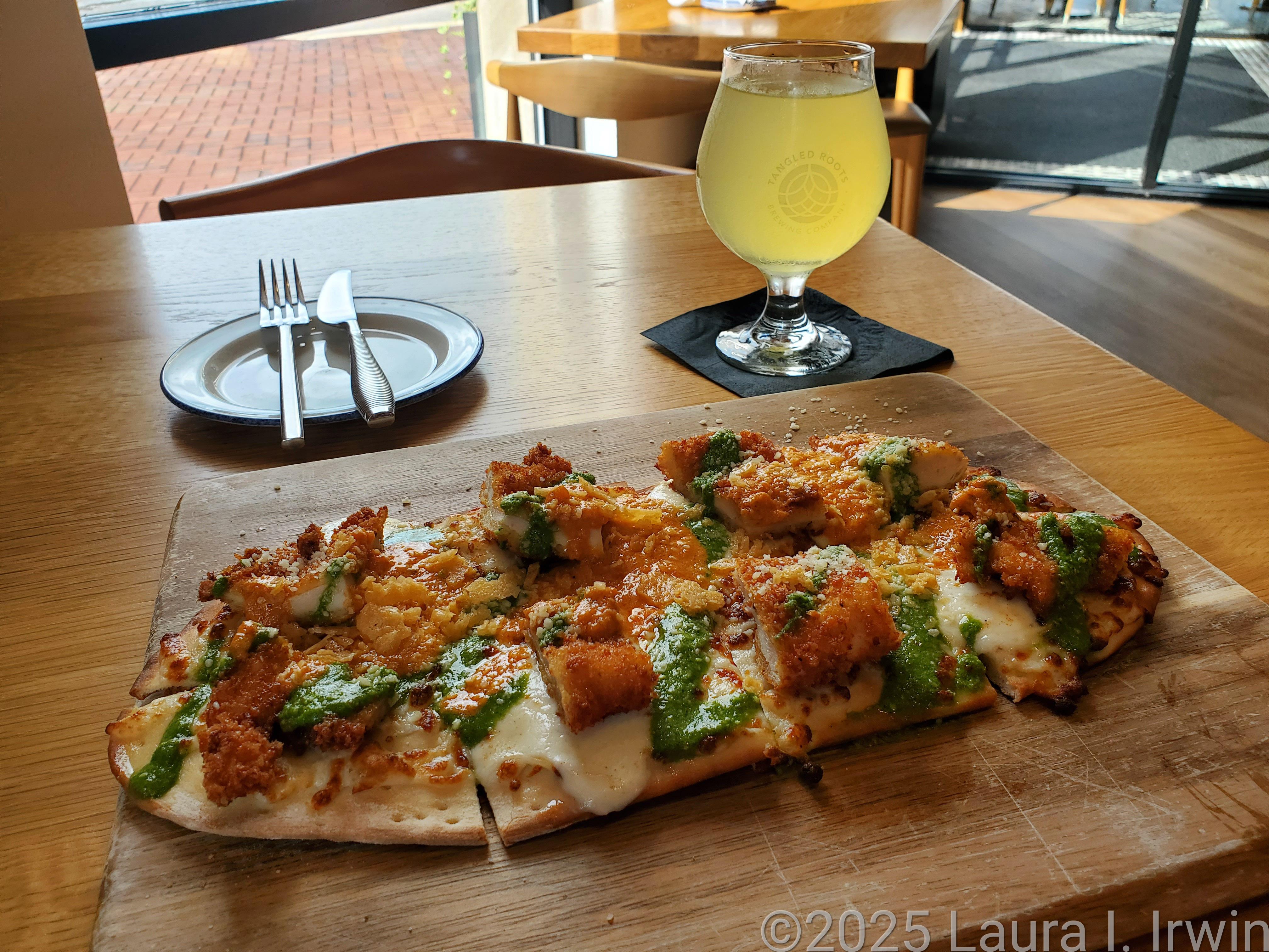 Last night’s dinner was so good that I didn’t want to set my expectations too high for tonight. But I’m happy to report that we are now two for two on the Chicago area dinners. I ended up at Tangled Roots Brewing Company for dinner and had a delicious chicken parmesan flatbread with vodka sauce and pesto along with a sweet hard cider from Obscurity Brewing (which was just a tad too sweet for my taste).