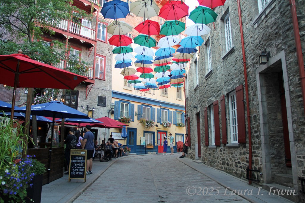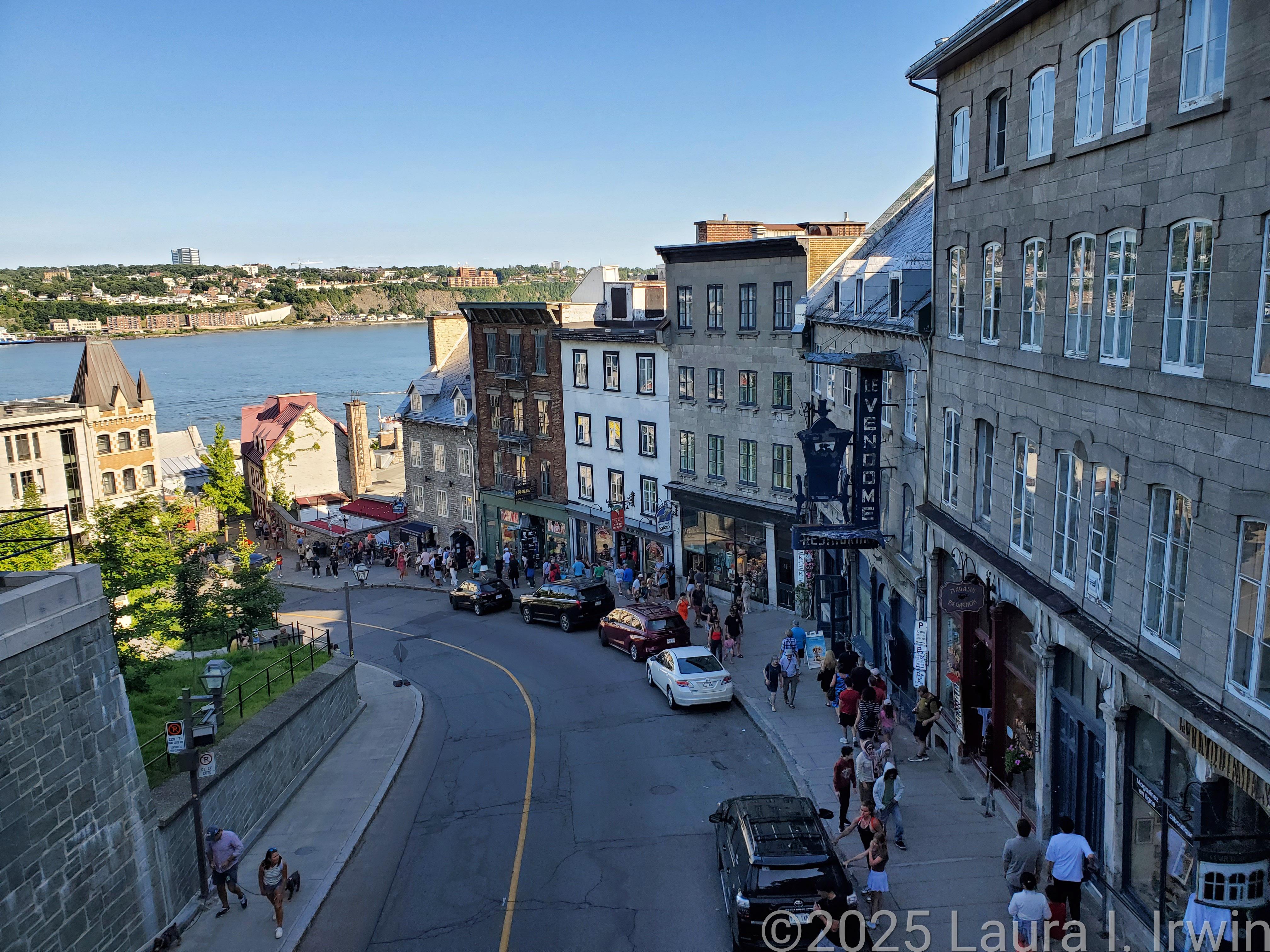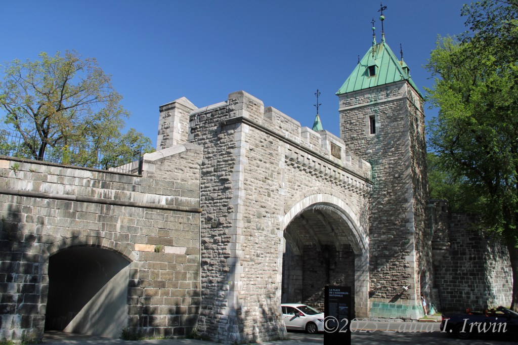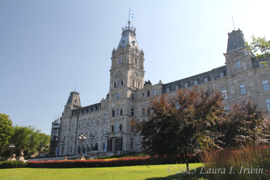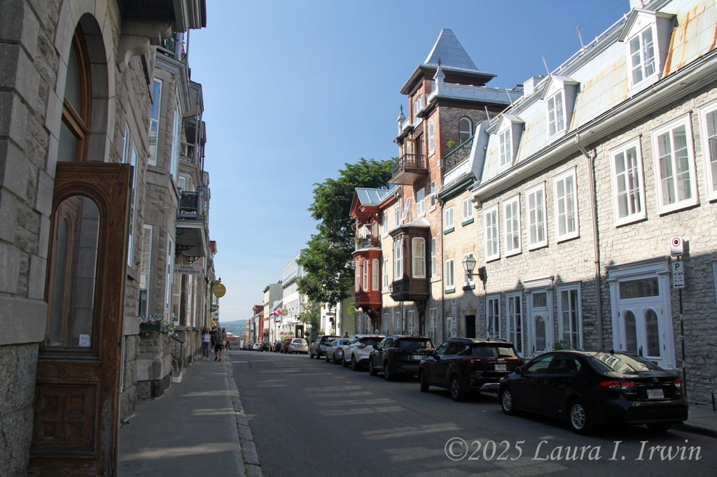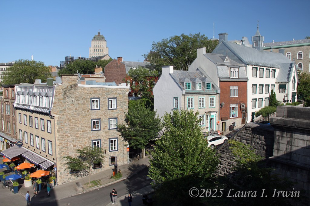 I stopped for a bathroom break and gas before crossing the border and was pleasantly surprised to be the only car at the border crossing. After answering the obligatory questions about where I was going and any weapons in my car, I was across the border and driving through rural Quebec. The further north I traveled, the less wildfire smoke was in the air. By the time I arrived in Québec City, the skies were almost entirely blue and the temperature was in the low 80s. I managed to find parking in the hotel garage and was able to get right into my room for a few minutes before heading out. I have a view of the St. Lawrence River and the iconic Fairmont Le Château Frontenac from my window, as well as the old city walls below.