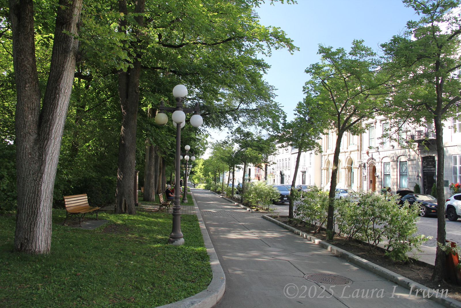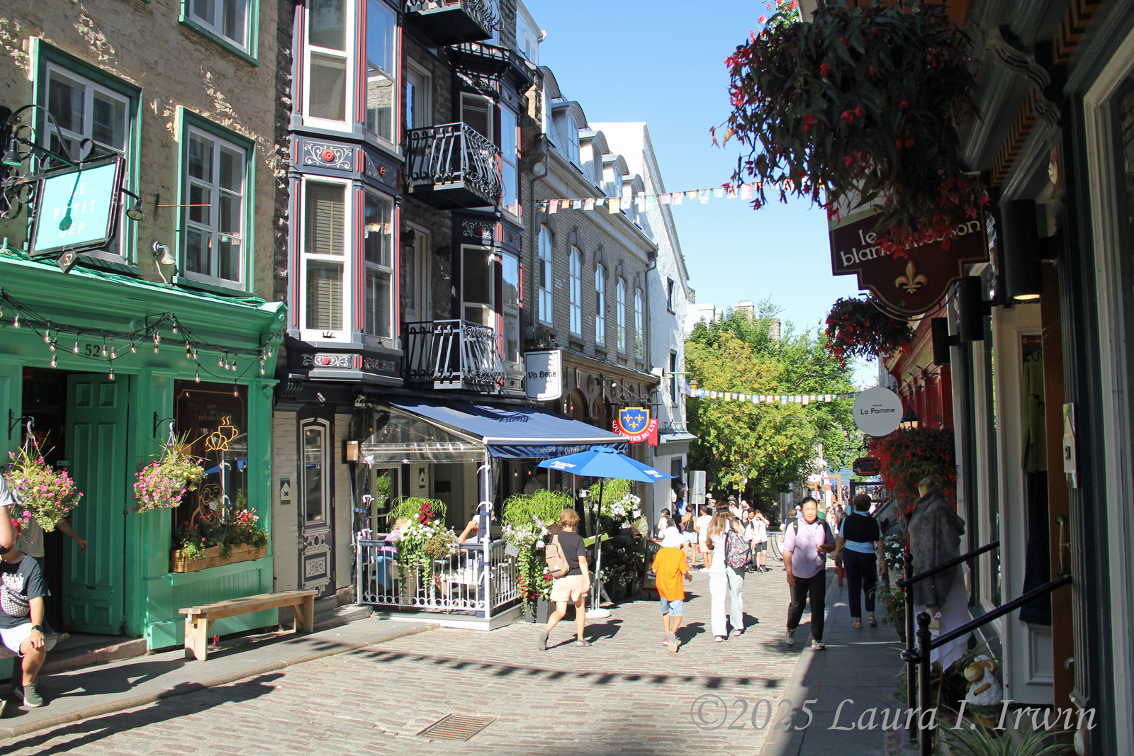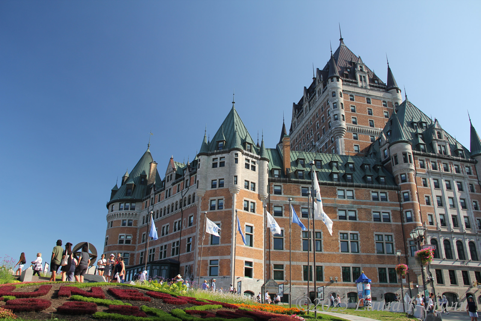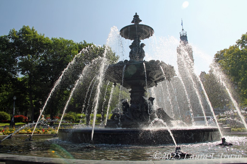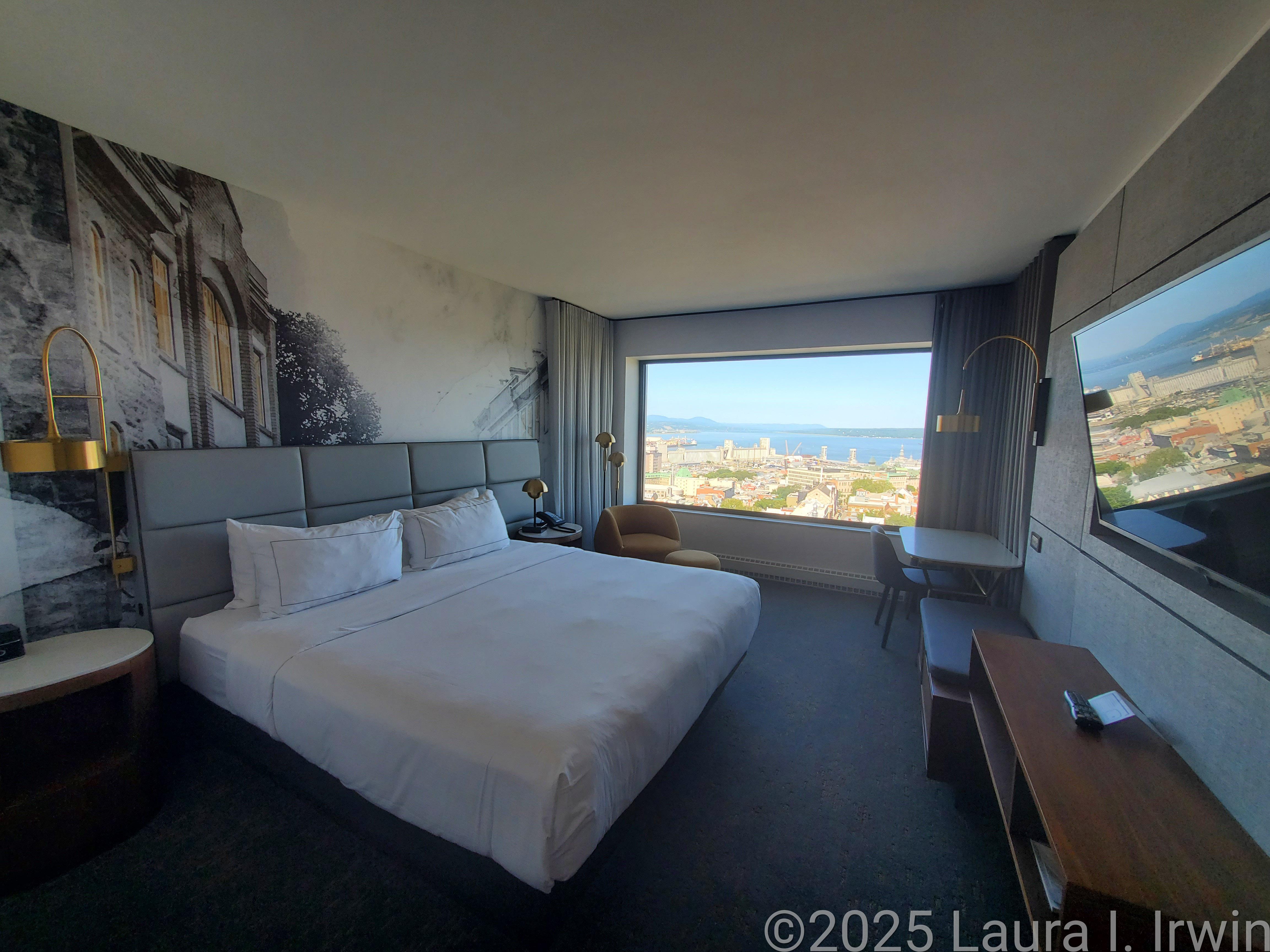 I stopped for a bathroom break and gas before crossing the border and was pleasantly surprised to be the only car at the border crossing. After answering the obligatory questions about where I was going and any weapons in my car, I was across the border and driving through rural Quebec. The further north I traveled, the less wildfire smoke was in the air. By the time I arrived in Québec City, the skies were almost entirely blue and the temperature was in the low 80s. I managed to find parking in the hotel garage and was able to get right into my room for a few minutes before heading out. I have a view of the St. Lawrence River and the iconic Fairmont Le Château Frontenac from my window, as well as the old city walls below.