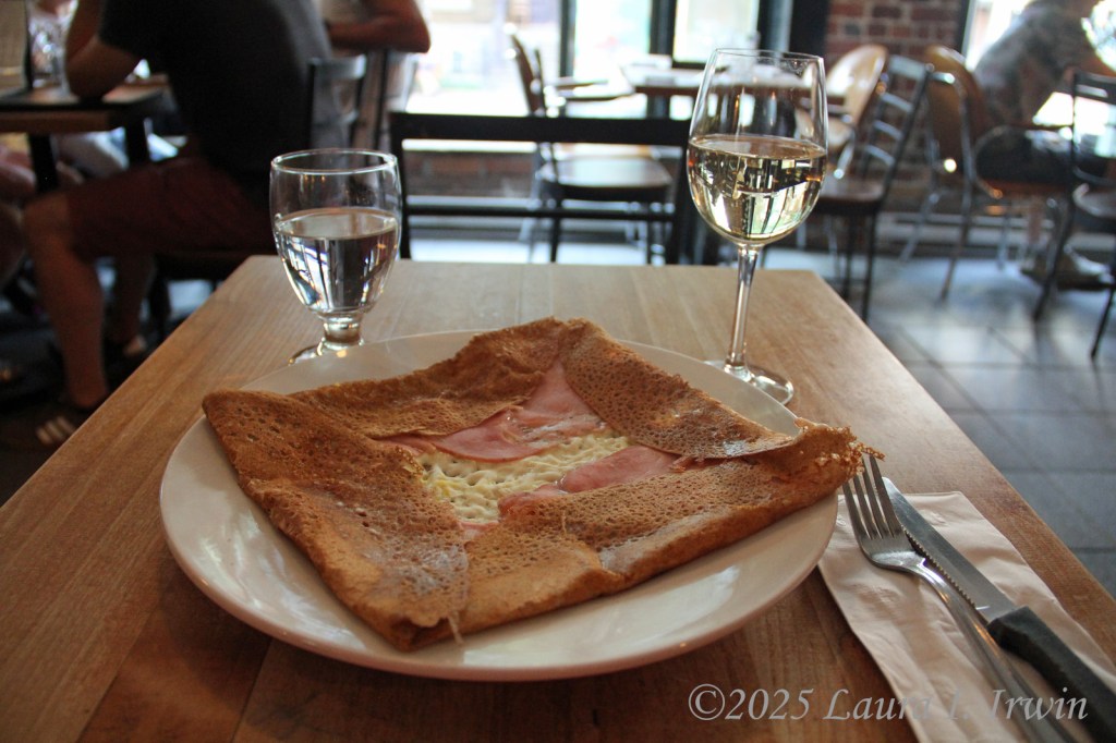 Le Billig is a small crêperie just outside the city walls and it reminded me of the crêperies in Paris. I had a ham, egg, and cheese crêpe for my main meal and then a lemon curd crêpe for dessert. The ham, egg, and cheese was good, but my goodness! The lemon curd crêpe was the stuff dreams are made of. The lemon curd was mixed with mascarpone, tucked inside the crêpe, and then the crêpe was rolled up and cut like a sushi roll before being drizzled with salted caramel. Delicious! (And if you’re keeping track, I had nothing but pancakes to eat today, save for some potato chips and Pop Corners in the car. I’m not counting calories today.) There was a whole list of ciders on the wall of the restaurant, all in French. I asked the waiter which one was good and he told me once I ordered my crêpe he would tell me which one would complement it the best. I have no idea what kind it was, but I had a delicious cider that was reminiscent of champagne but with a slightly sweeter apple taste. It was good enough that I ended up having two glasses!