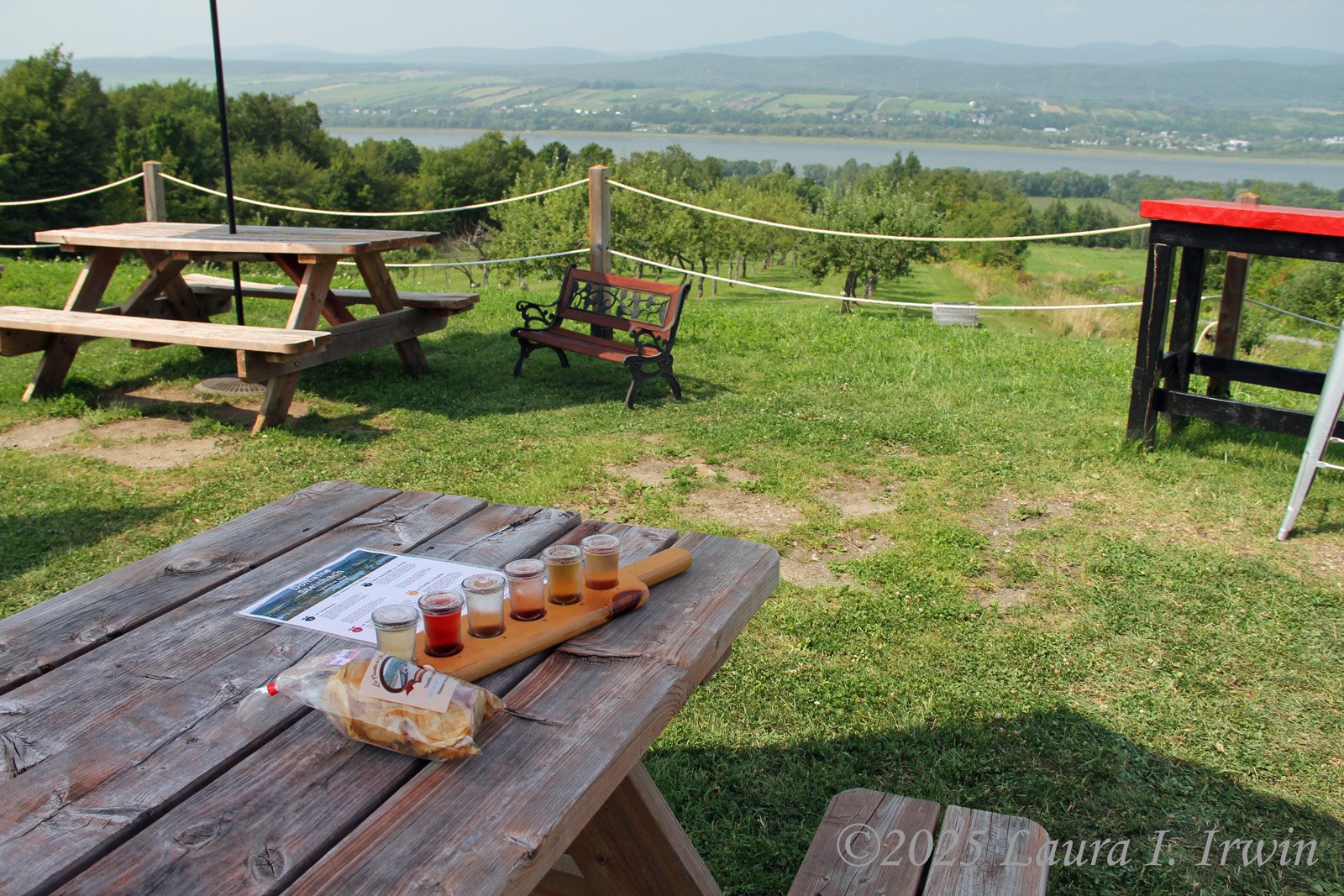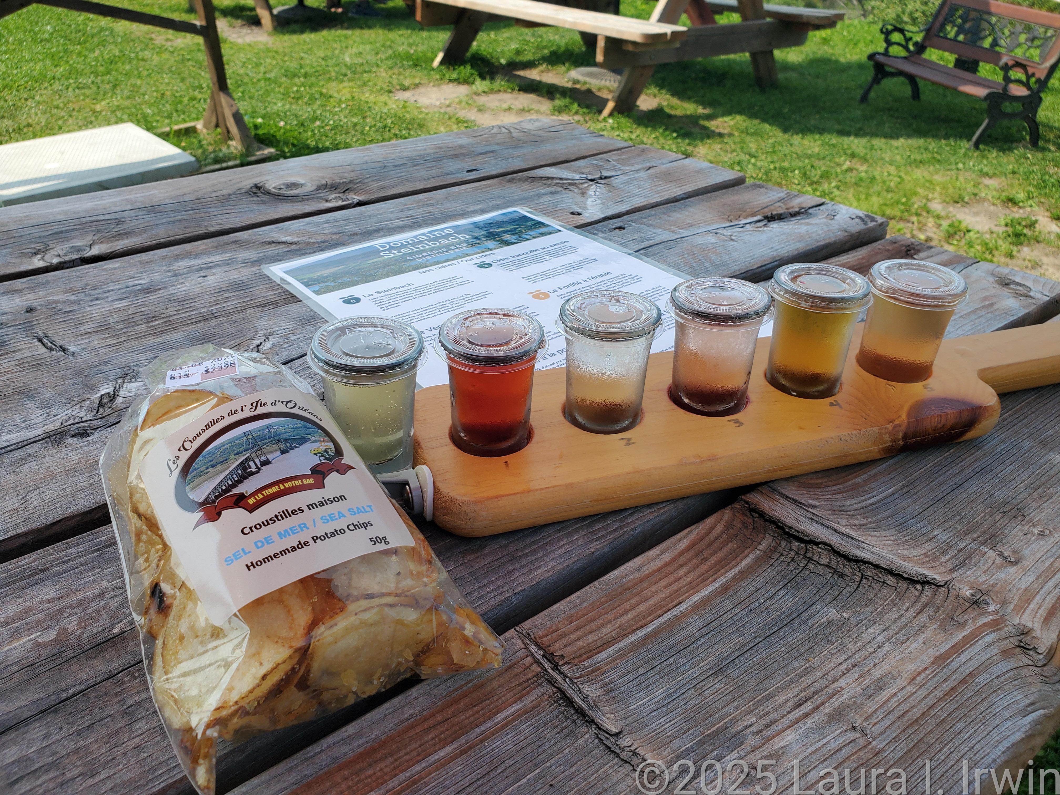 The redeeming part of my visit to Île d’Orléans was the cider. I stopped at two cideries on the north side of the island and sampled 10 different ciders. First up was Domaine Steinbach, with a gorgeous view over the orchard and St. Lawrence River. Here, I had a flight of six ciders. These were very small tastes so my worry about drinking on an empty stomach went out the window. I got a bag of potato chips to have with the cider and sat at a picnic table on the lawn. The glasses might have been small, but the last two were each 17% alcohol!