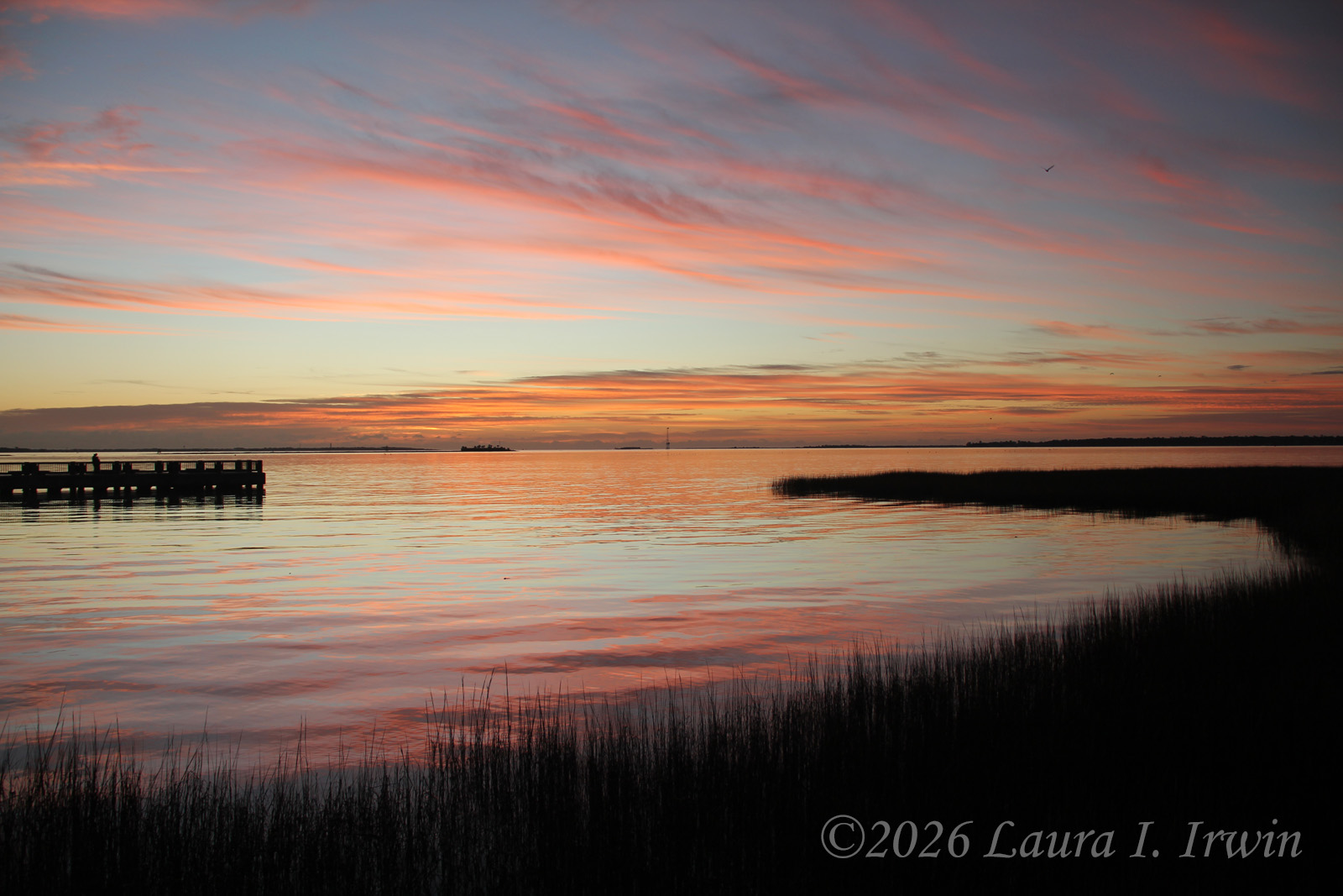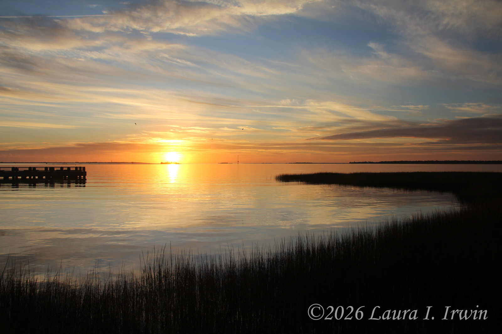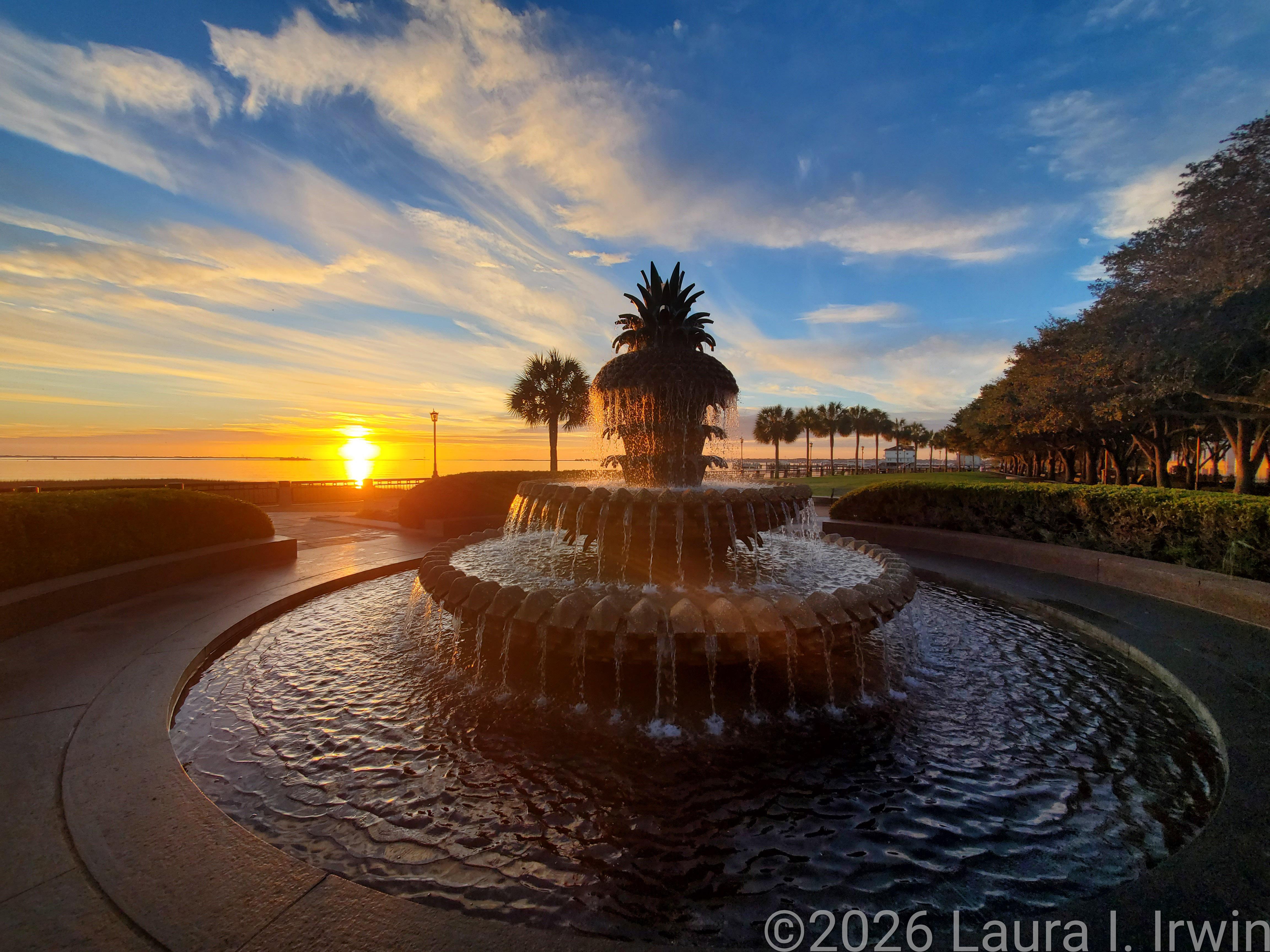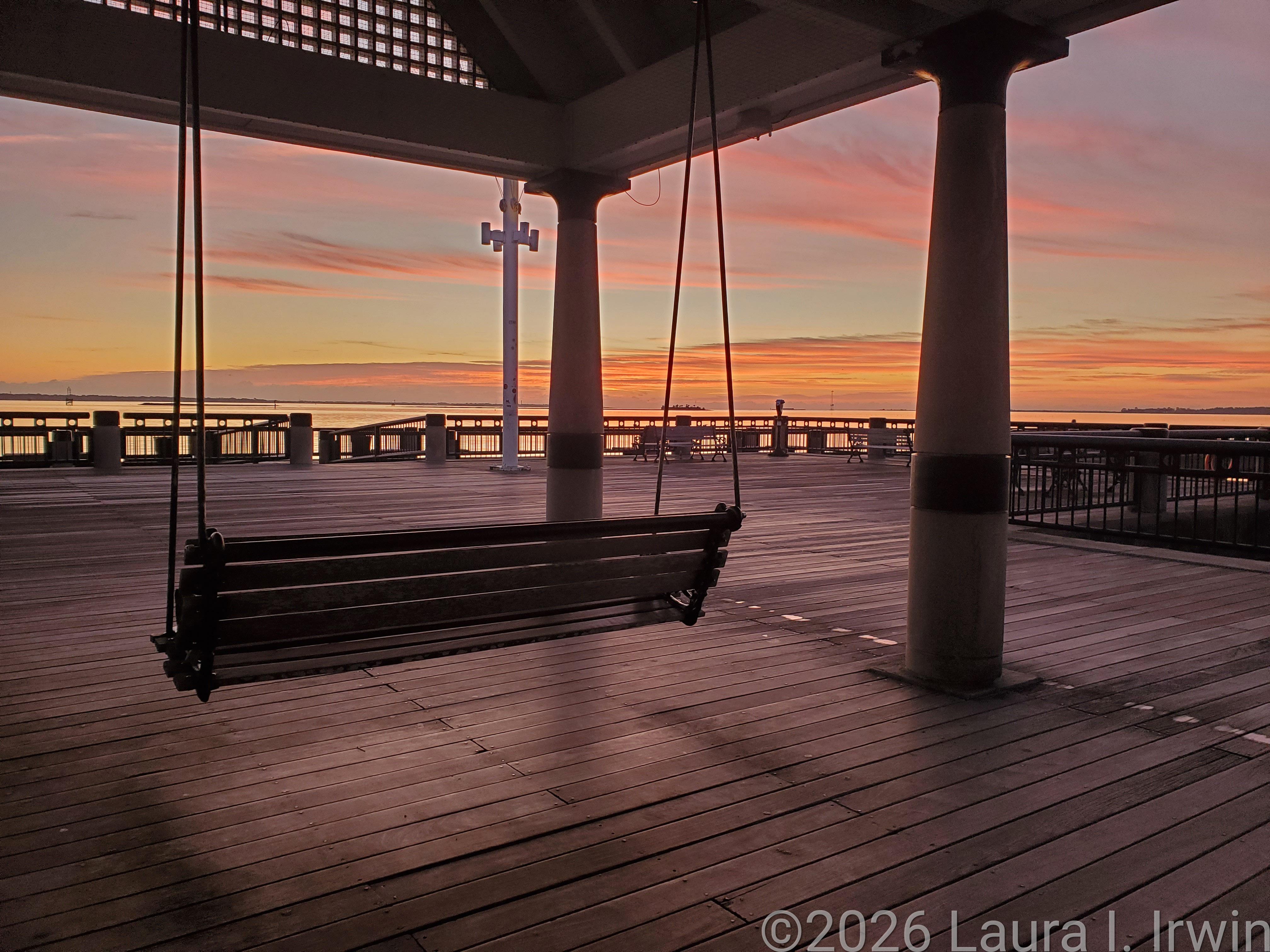 Despite a mere three and a half hours of sleep last night, I was up at 4AM and ready to go for my sunrise walk around Charleston. I walked over to the Waterfront Park, perched myself on a swing, and enjoyed the pre-sunrise color in the sky. Once I walked out onto the pier, I could see several dolphins out in the water for their morning swim.