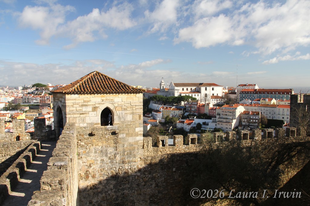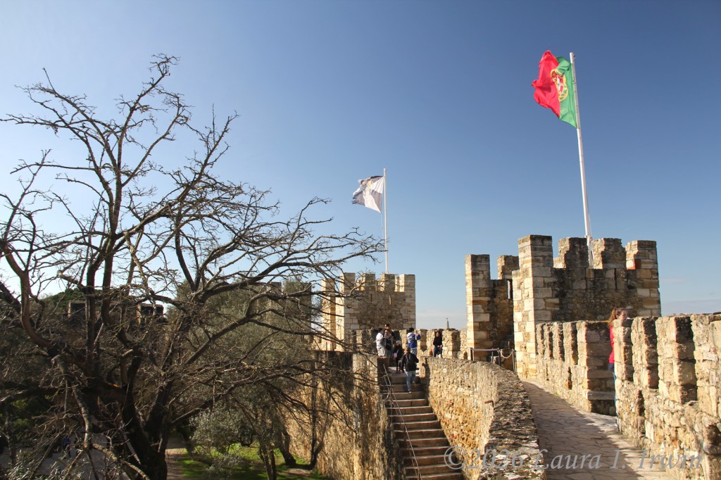 After paying entry to the castle grounds, the first attraction is the main square, which provides a commanding view over much of Lisbon. Below the castle is the Baixa district (low town) and then Bairro Alta rises up on the other side. I wandered along the viewpoints, then headed up to the castle walls where you can climb up and down the ramparts, in many places sans railing, as you look out over the city and Targus River.