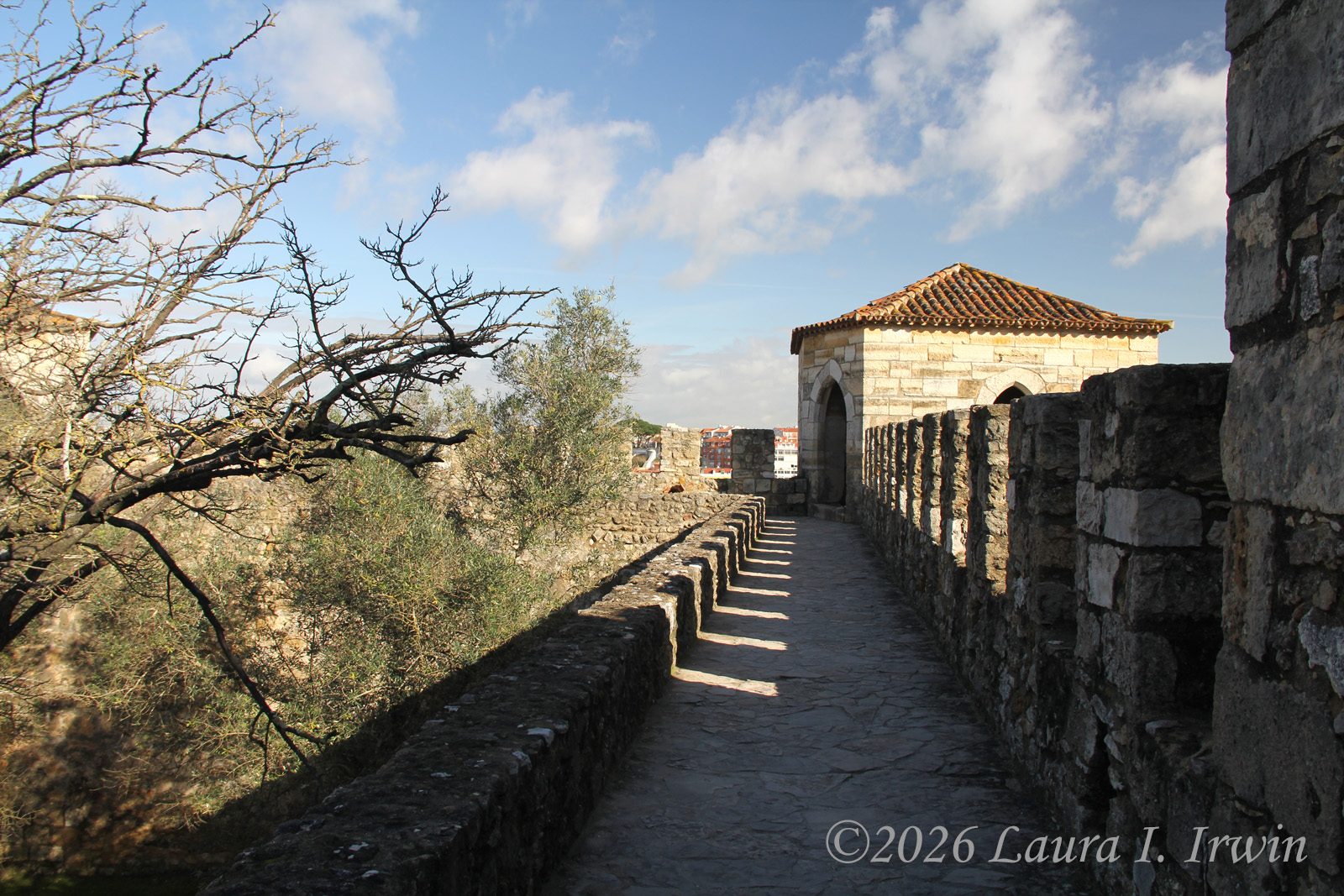 After paying entry to the castle grounds, the first attraction is the main square, which provides a commanding view over much of Lisbon. Below the castle is the Baixa district (low town) and then Bairro Alta rises up on the other side. I wandered along the viewpoints, then headed up to the castle walls where you can climb up and down the ramparts, in many places sans railing, as you look out over the city and Targus River.