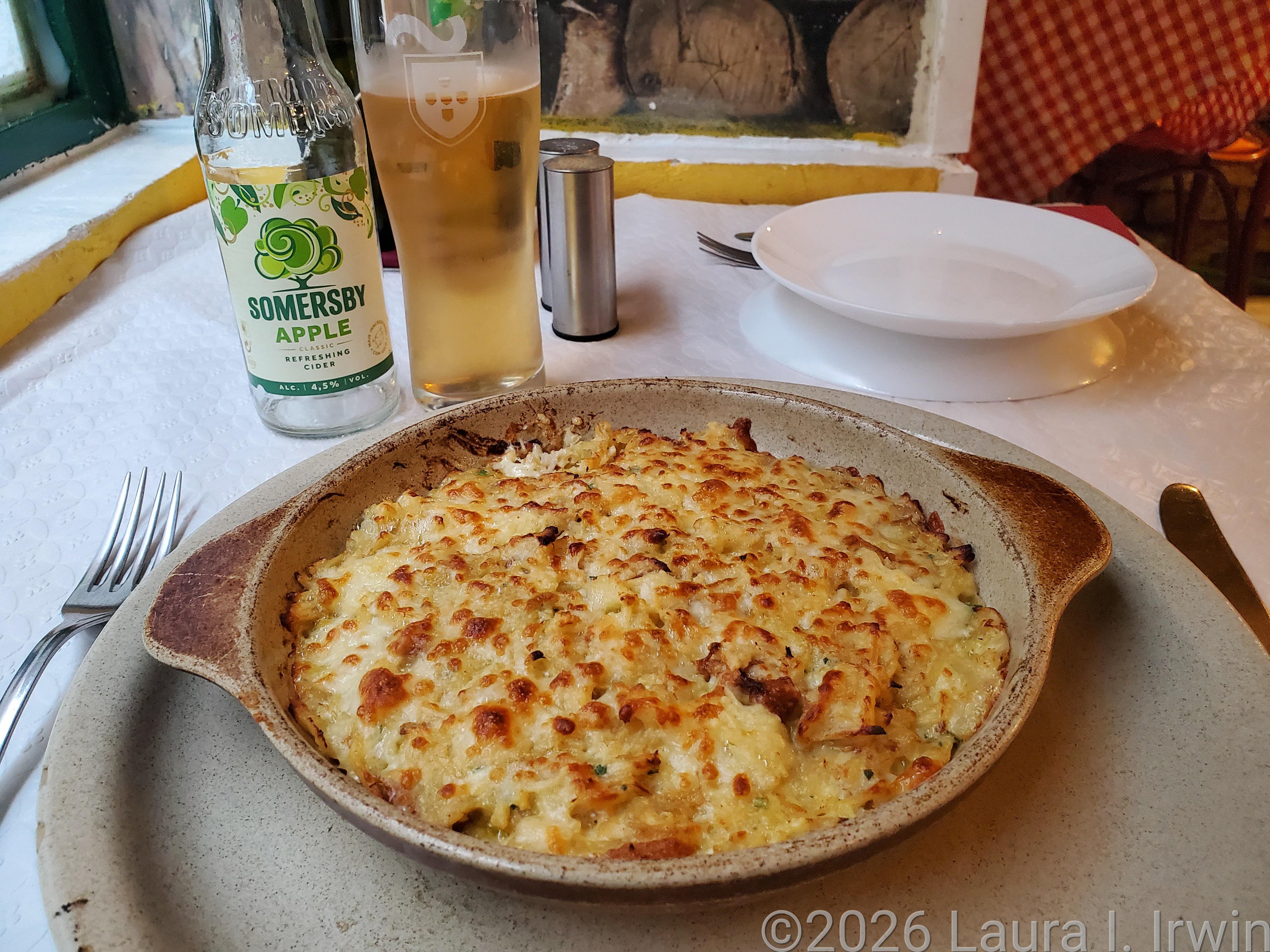By the time I was done with my short visit, my legs were getting tired and I was ready to rest. Sufficiently refreshed after a couple of hours in my room editing pictures, I was off to find dinner. I headed up into the hillside of Bairro Alto where I know there are many small restaurants. I looked at some menus and decided on A Tasca do Bairro Alto. I took a step outside of my comfort zone and ordered bacalhau com natas, a baked casserole of shredded cod, onions, potatoes, cream, and cheese. It was very, very rich. I only ate part of it, but I’m glad I tried it. For dessert, I had the caramel mousse, which was described to me as a custard made with egg yolks and condensed milk. It, too, was very rich, so I’m thankful it was also very small. Somersby cider seems to be the go-to cider in Lisbon so I had a bottle of that as well. Lisbon is a very affordable city. My meal tonight was only €23, or about $27 US dollars. And like much of Europe, tipping isn’t really a thing that’s done here.