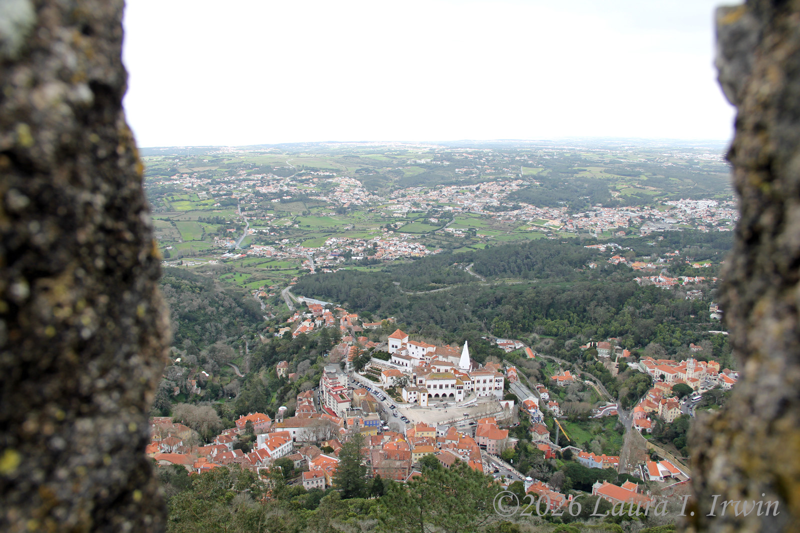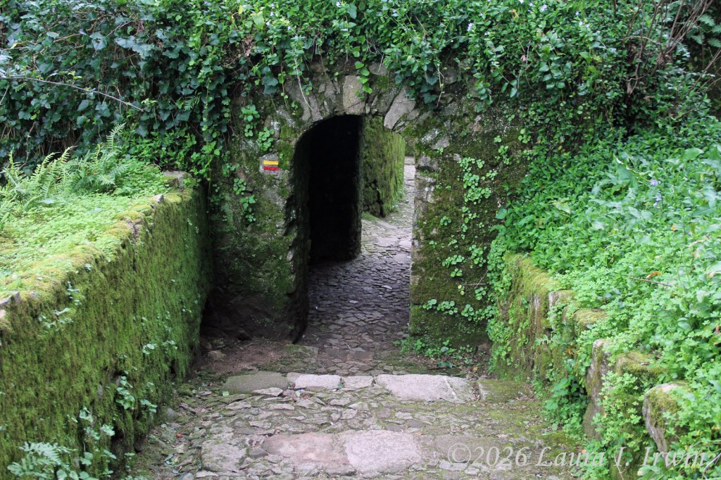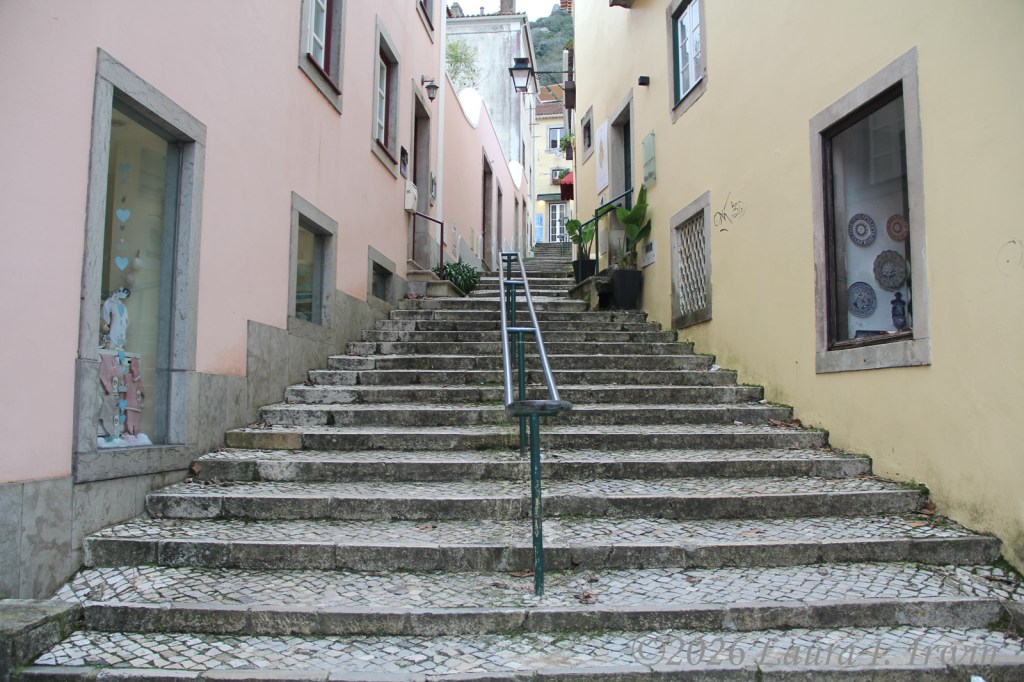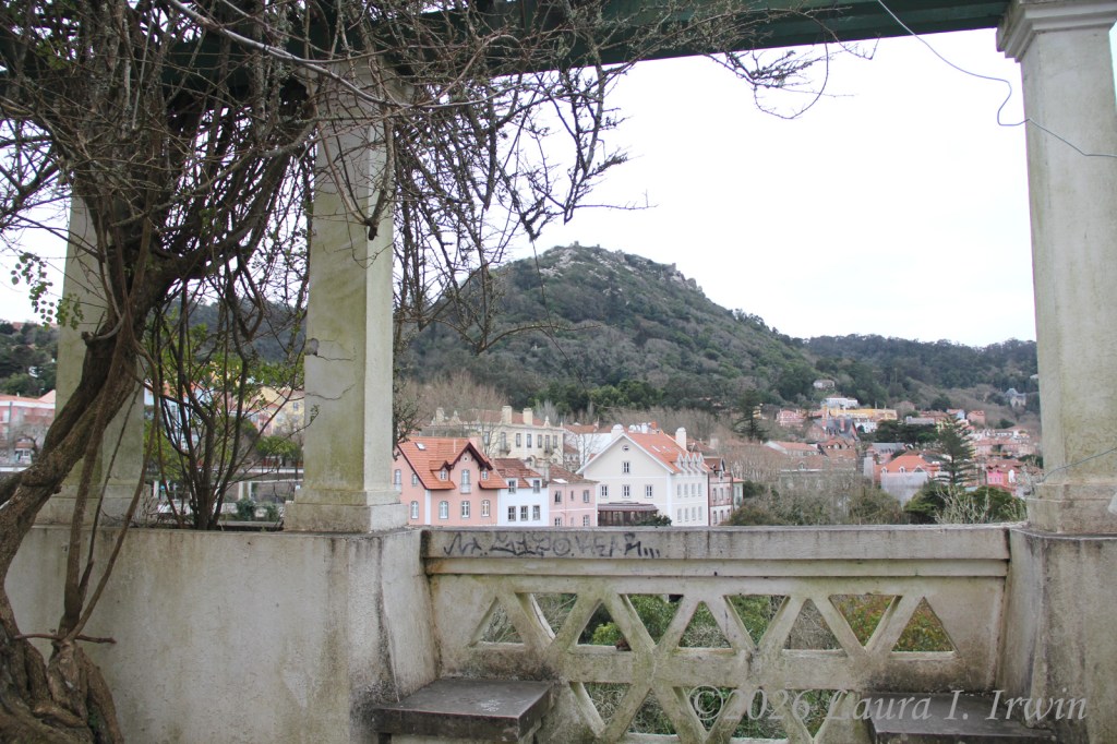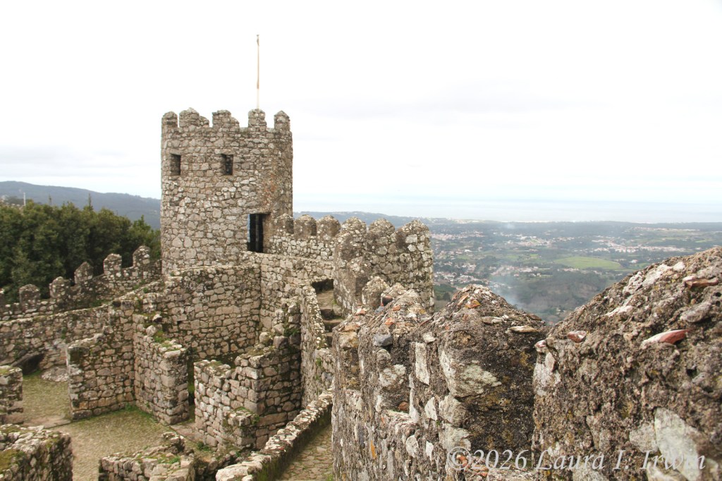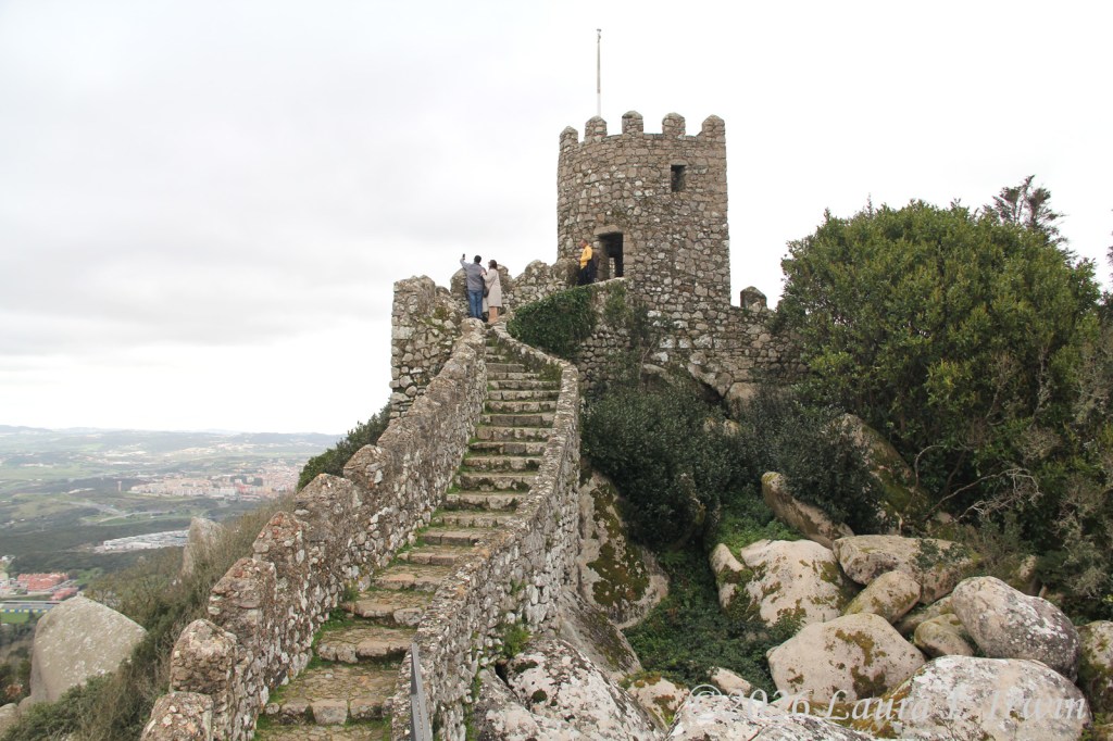 After Pena Palace, I hiked over to the Moorish Castle, also set high on a hill and about 15 minutes (downhill and then back up) from Pena Palace. As if I hadn’t done enough uphill hiking, the castle involves a LOT of steep steps. I climbed up and down taking pictures and enjoying the views overlooking Sintra, the surrounding towns, and the distant coastline. You can also see Pena Palace on the hill above.