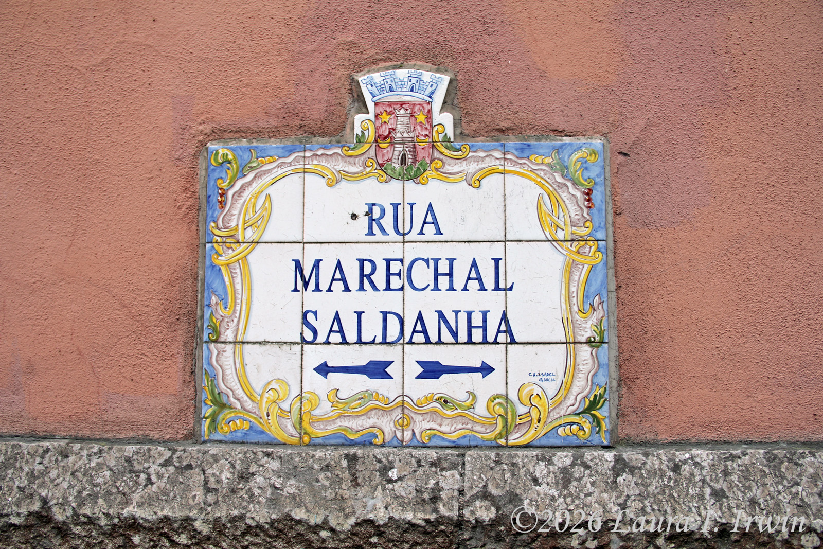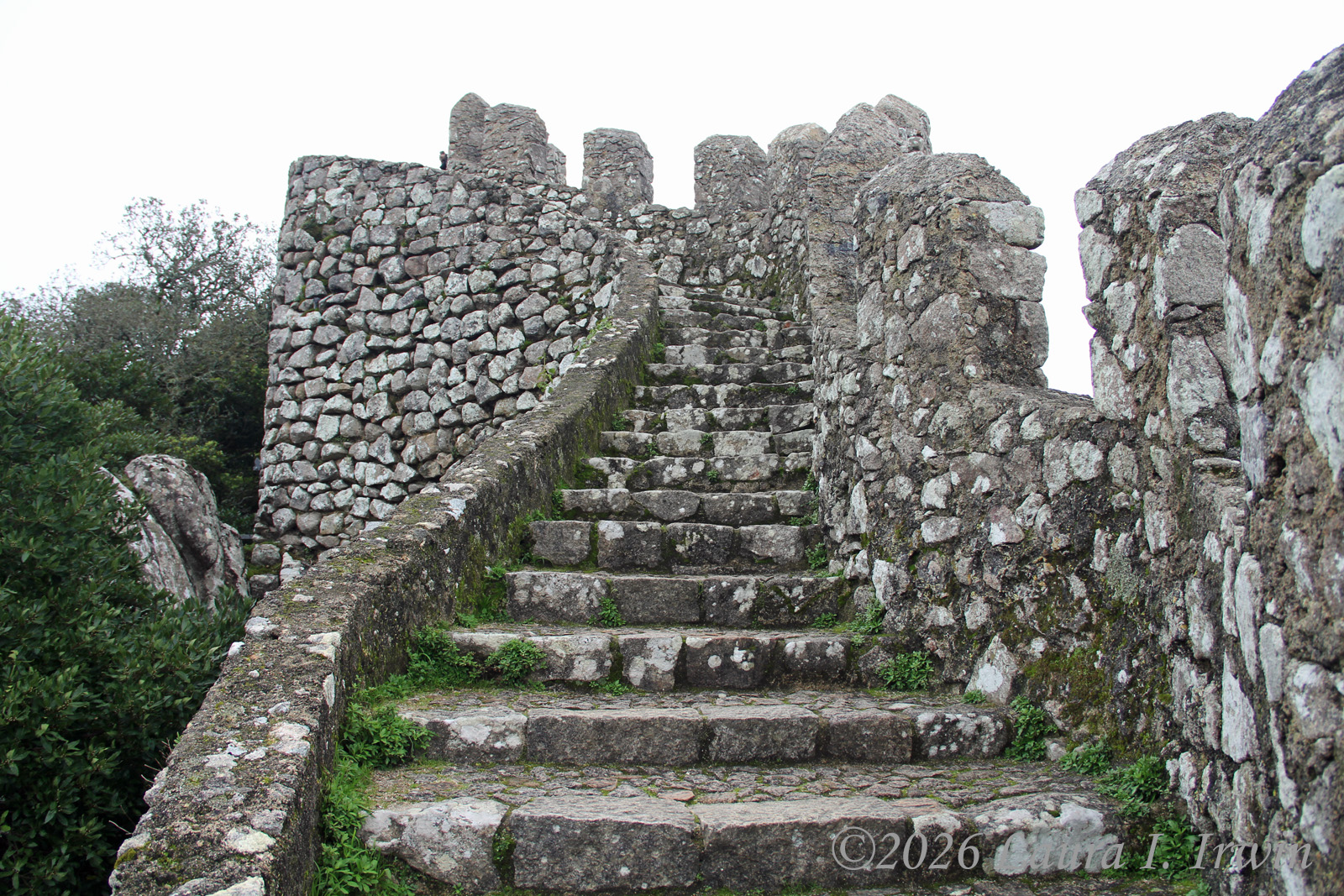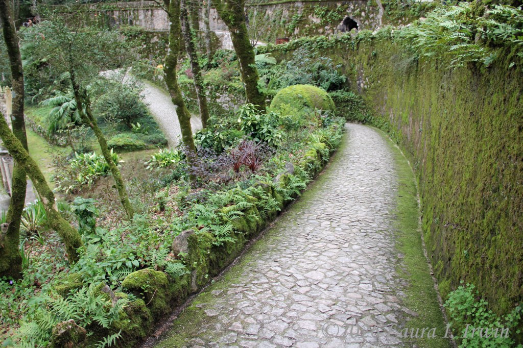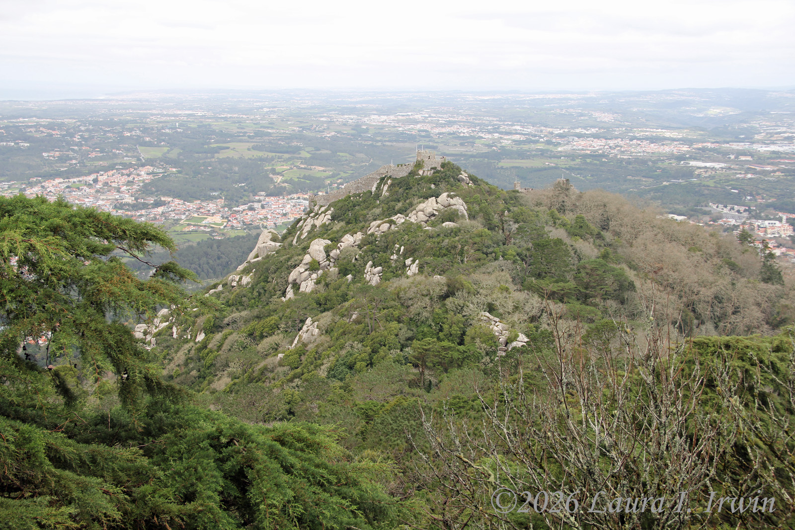 After Pena Palace, I hiked over to the Moorish Castle, also set high on a hill and about 15 minutes (downhill and then back up) from Pena Palace. As if I hadn’t done enough uphill hiking, the castle involves a LOT of steep steps. I climbed up and down taking pictures and enjoying the views overlooking Sintra, the surrounding towns, and the distant coastline. You can also see Pena Palace on the hill above.