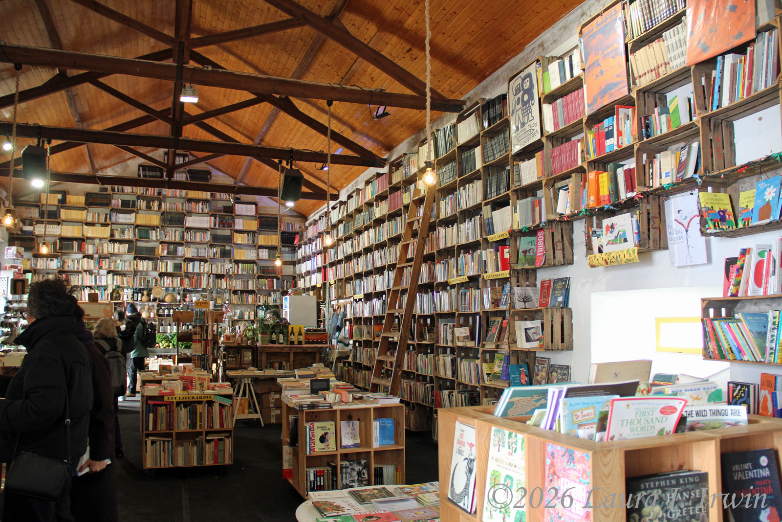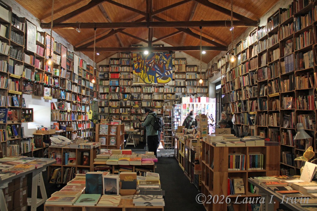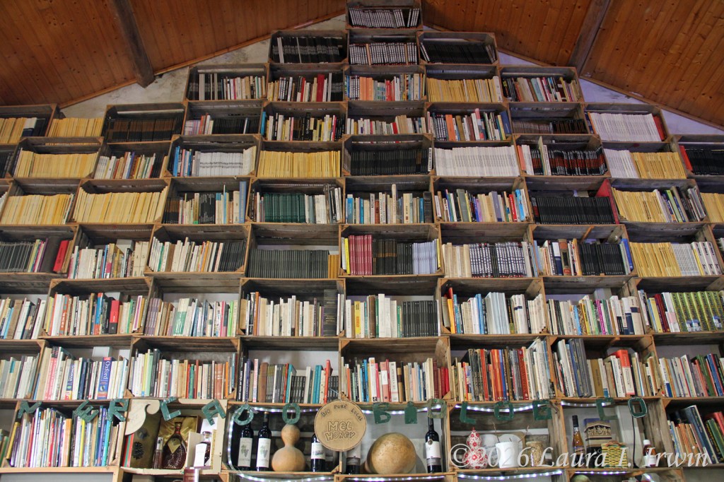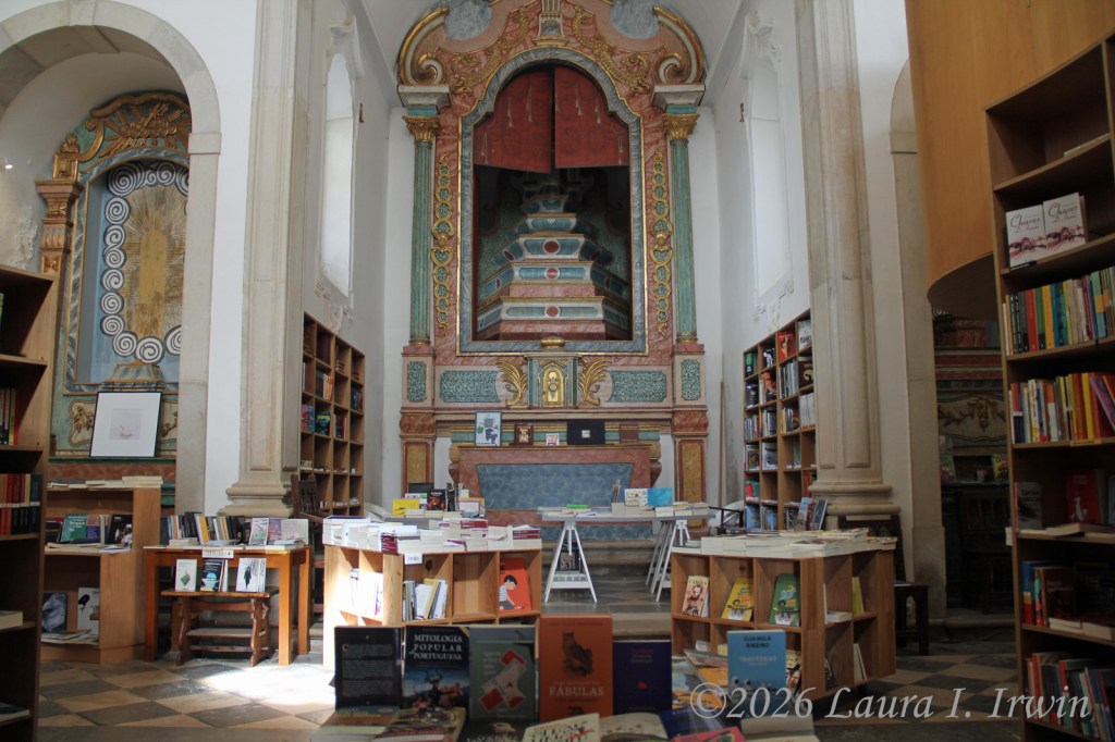 I still had many streets to explore and wanted to look in some of the shops before lunch. I knew there was a church-turned-bookstore in Óbidos. But little did I know there is a fireman’s hall-turned-bookstore and market as well. Both have the same owners and both are totally unique. Livraria Do Mercado is a former fireman’s hall which now houses stacks of books reaching to the ceiling, as well as a green market selling local fruits and vegetables. Livraria de Santiago is the former Igreja de Santiago, a church commissioned in the year 1186, now a bookshop which still preserves some of the church’s history.