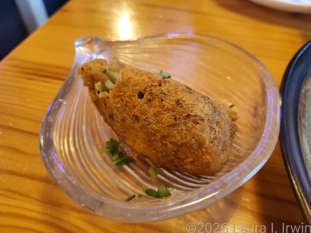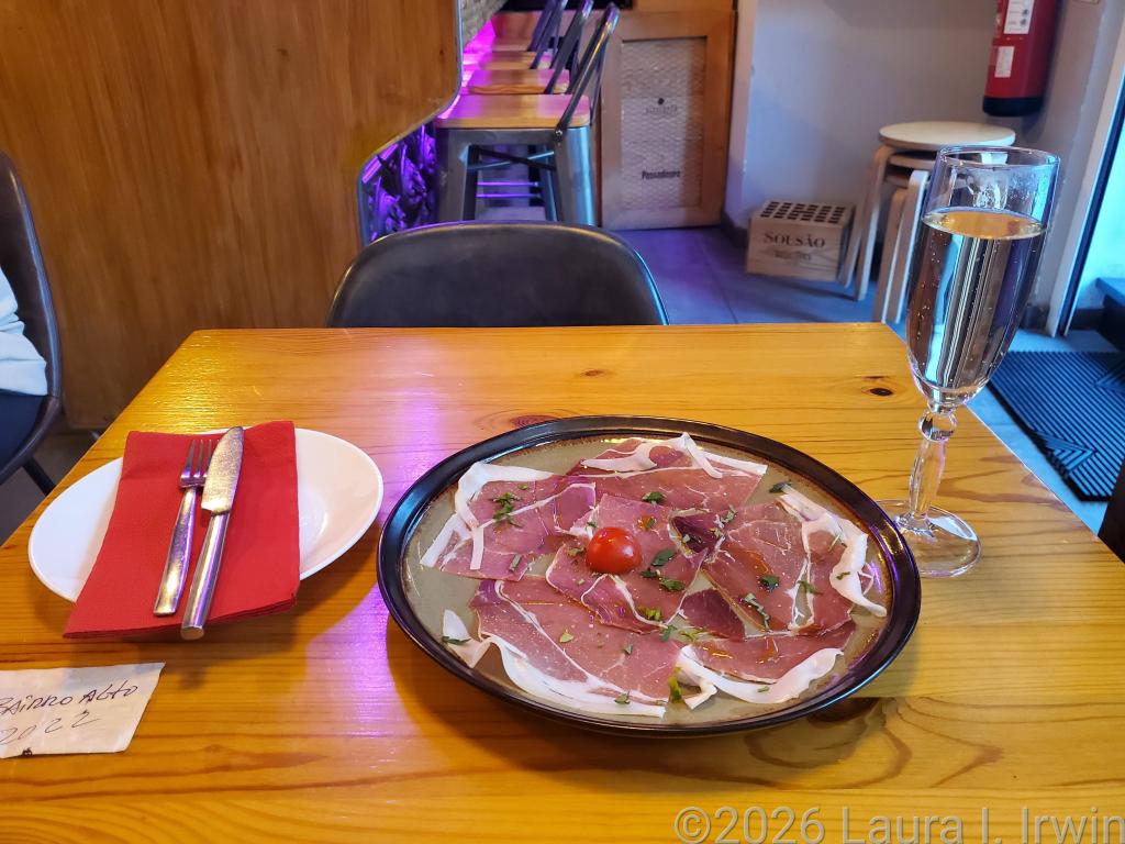 Once I returned to Lisbon, I headed back to my hotel for a bit. I put off the packing and edited some pictures instead. Then I figured after already having had a cider and a shot of ginjinha today, why not go to a wine bar for dinner? I’m not a cherry person, and I’m also not much of a wine drinker. I’ll have it occasionally, but hard cider is my drink of choice. The Little Wine Bar gets rave reviews online so I headed there for my last dinner in Lisbon. I tried a sample of Vinho Verde (green wine from the northern regions of Portugal; not for me) and then ordered a glass of sparkling wine, a board of smoked ham, and a pastéis de bacalhau (codfish cake/ fritter). I was prepared to not like the pastéis de bacalhau but it was actually not bad, in a fried mashed potato kind of way.