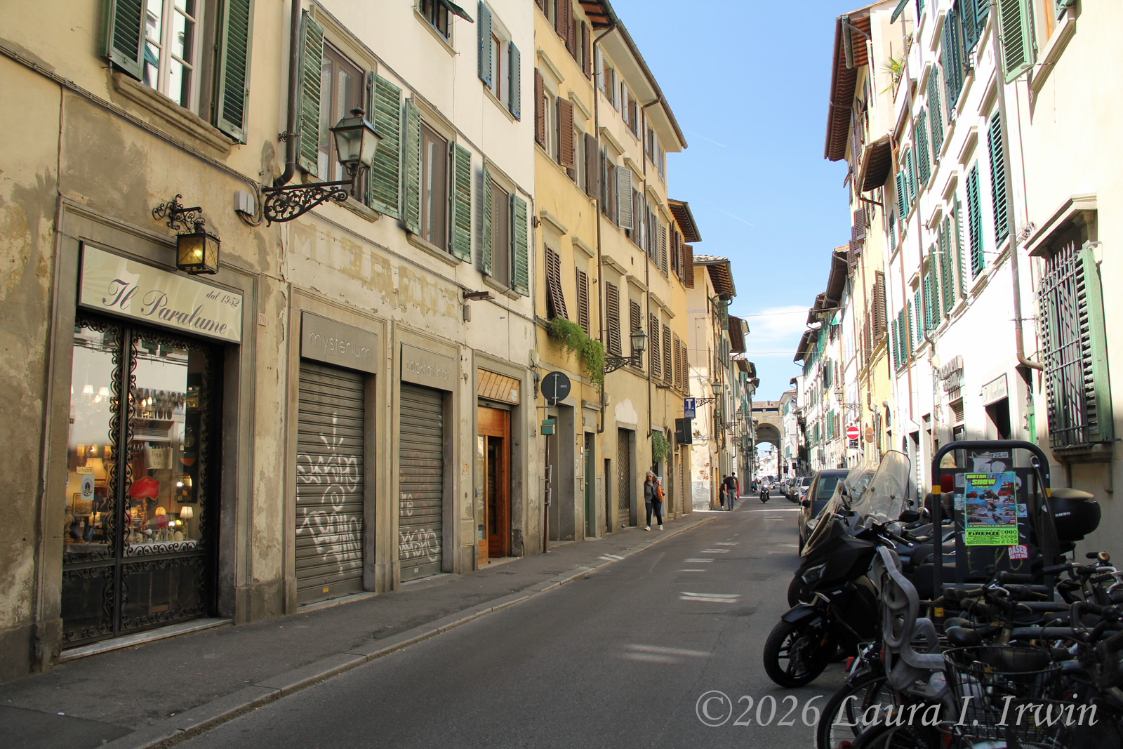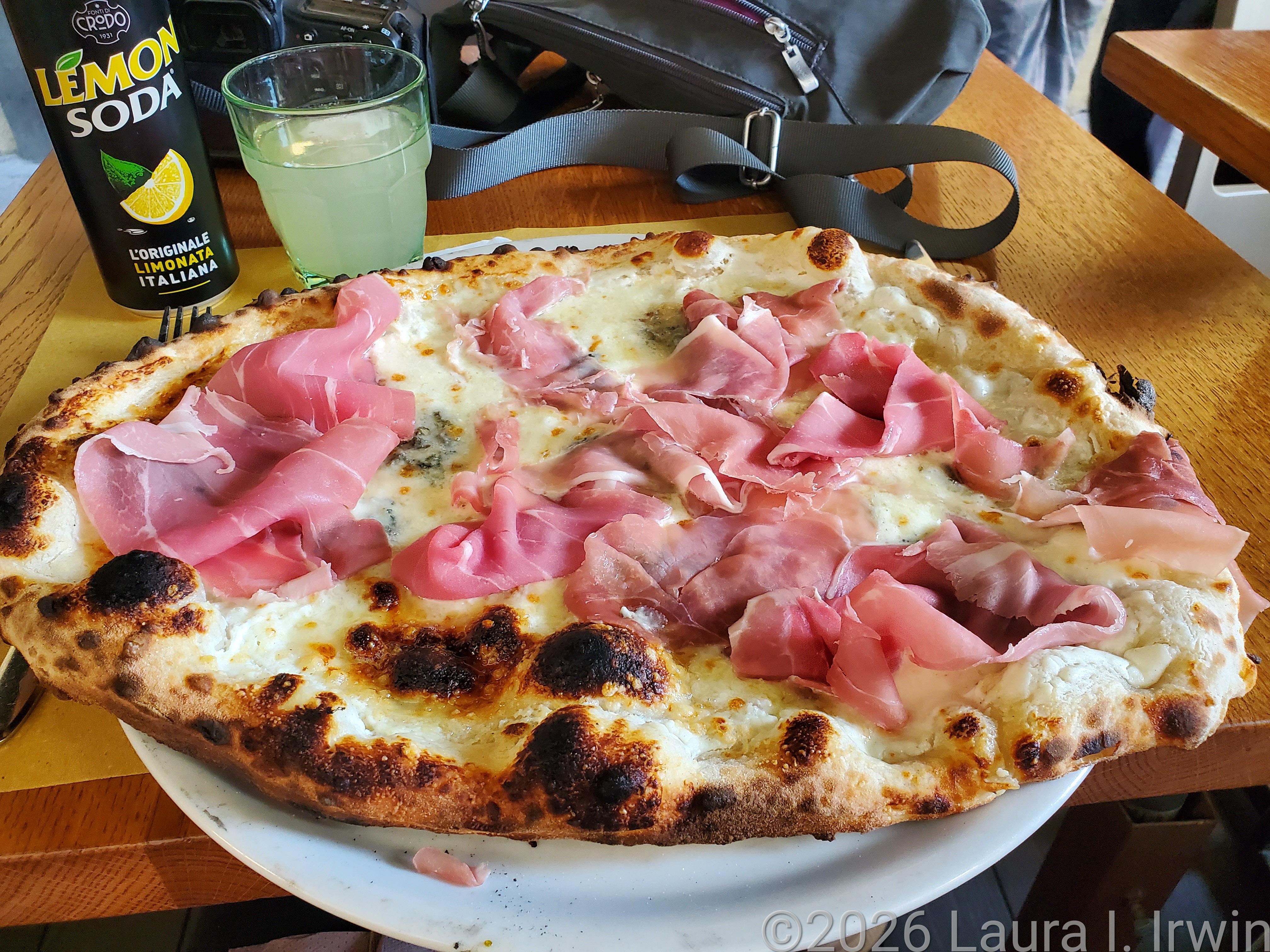 Not only were the gardens crowded today, the streets of Florence were as well. And I hate crowds. I consulted my paper map (yes, paper) for directions to Gustapizza, also in the Oltrarno neighborhood. Florence isn’t known for its pizza, but this pizza hit the spot with four cheeses and prosciutto along with my favorite Italian lemon soda.