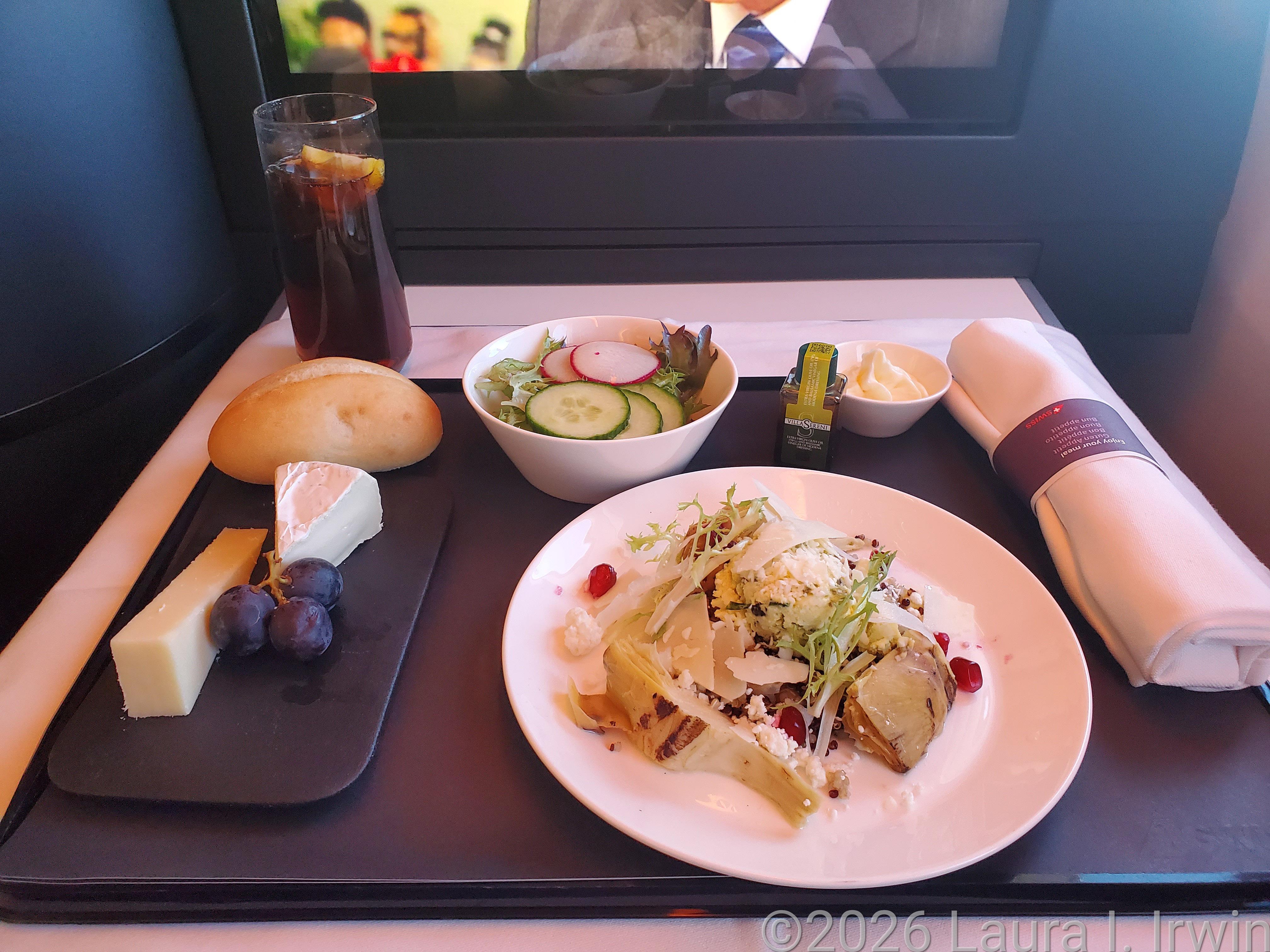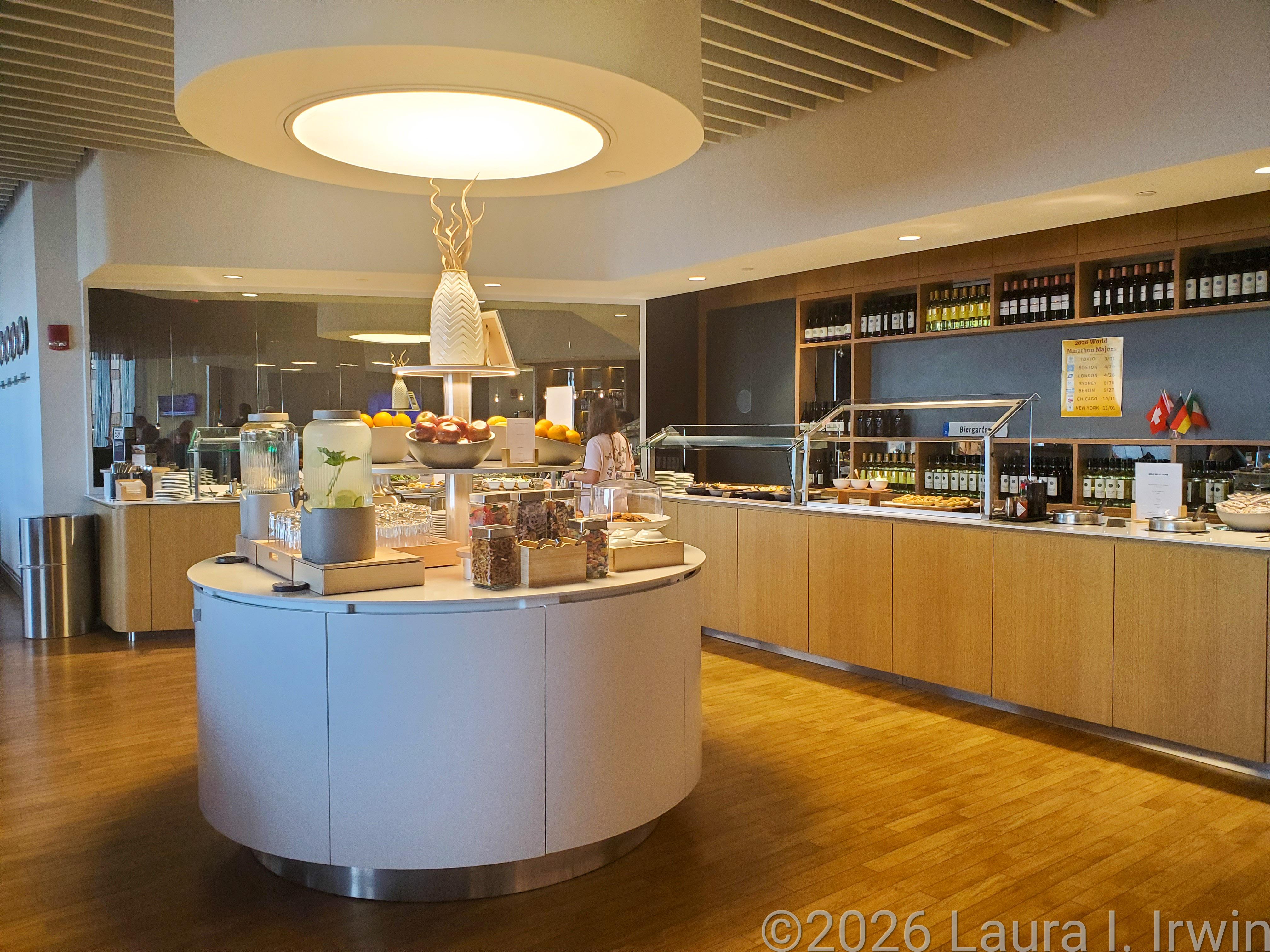 But first things first. My flight was slightly delayed, which gave me some extra time to enjoy the Lufthansa lounge in Boston. A plate of prosciutto and cheese, a Bavarian pretzel, and a glass of sparkling wine proved to be fortuitous given the quality/choice of food on the plane.