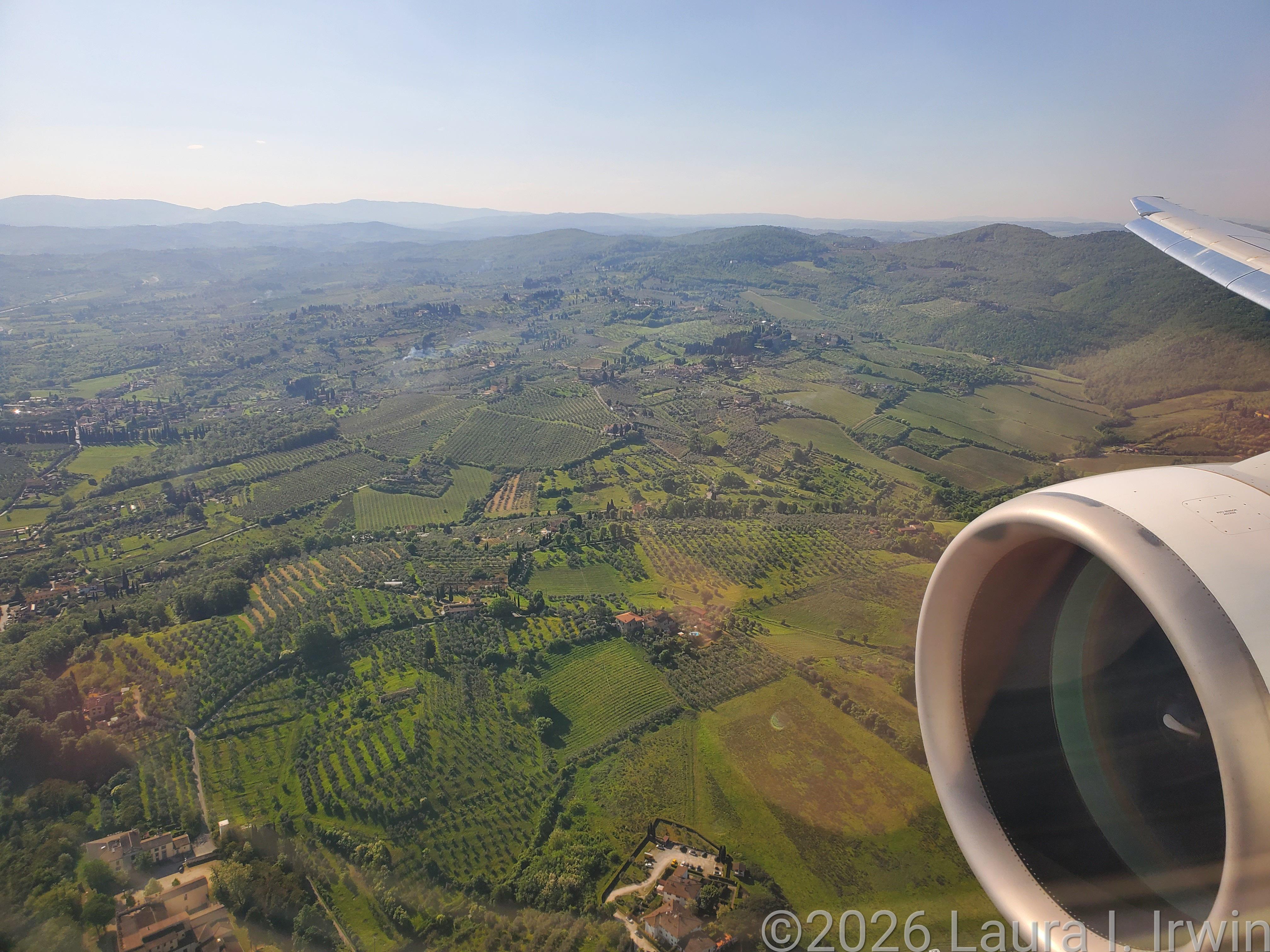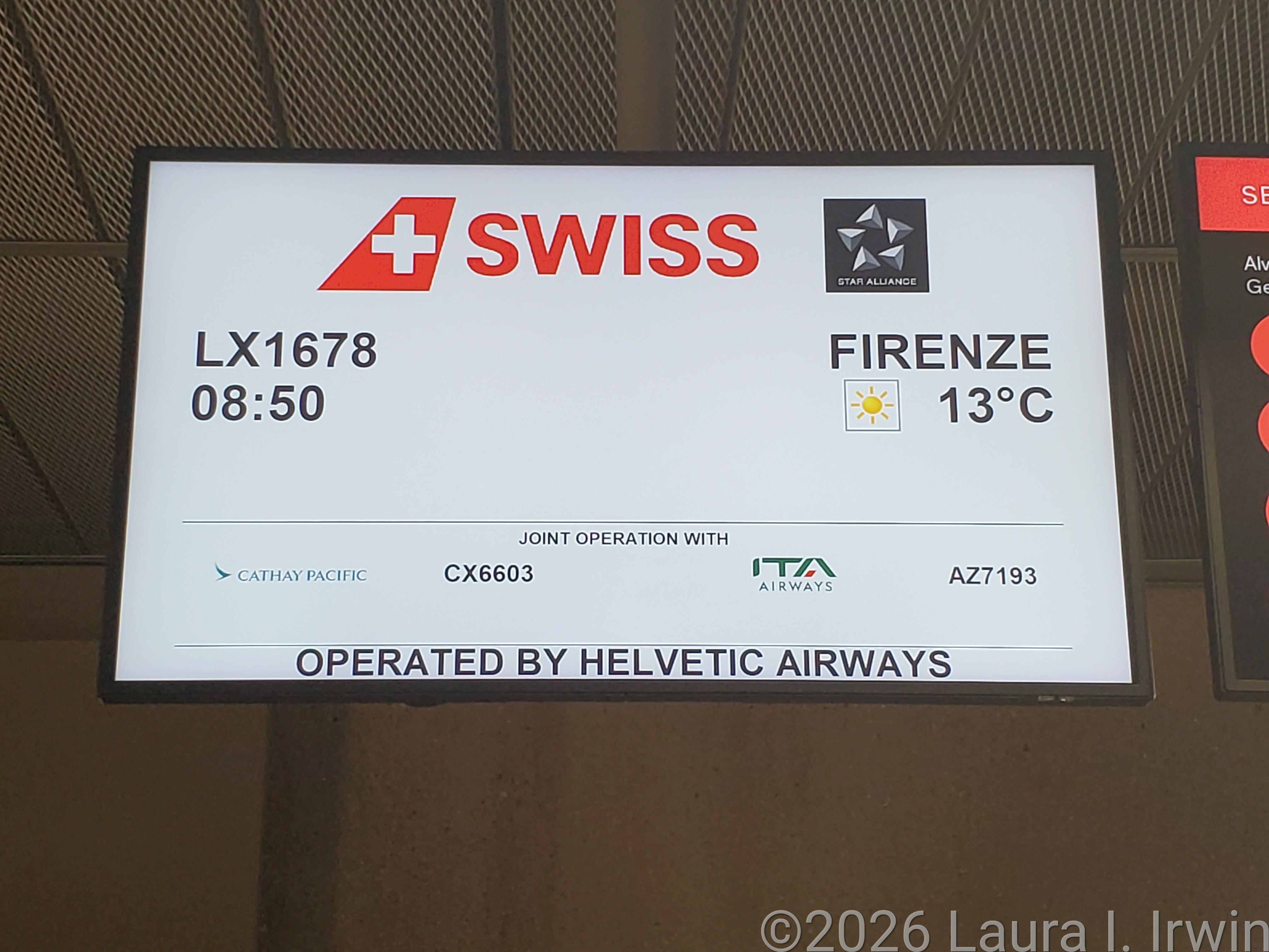 I had a little time to kill in the Swiss Business Lounge in Zurich where I feasted on scrambled eggs, apple strudel, and a waffle (or two) with vanilla sour cream. My second flight (to Florence) was on Swiss Air’s regional partner, Helvetic Airlines. My warm croissant with butter and apricot marmalade made for a delicious third breakfast of the day. I can’t imagine there’s a more beautiful way to get to Florence than flying over the Alps and then descending down into the rolling green hills of Tuscany.