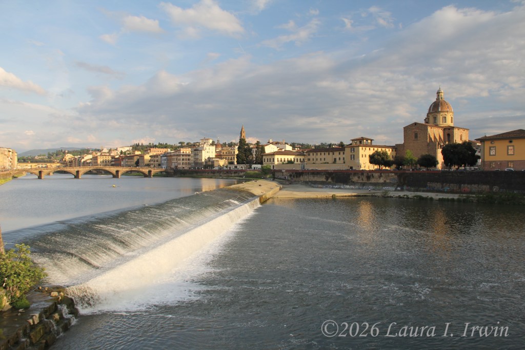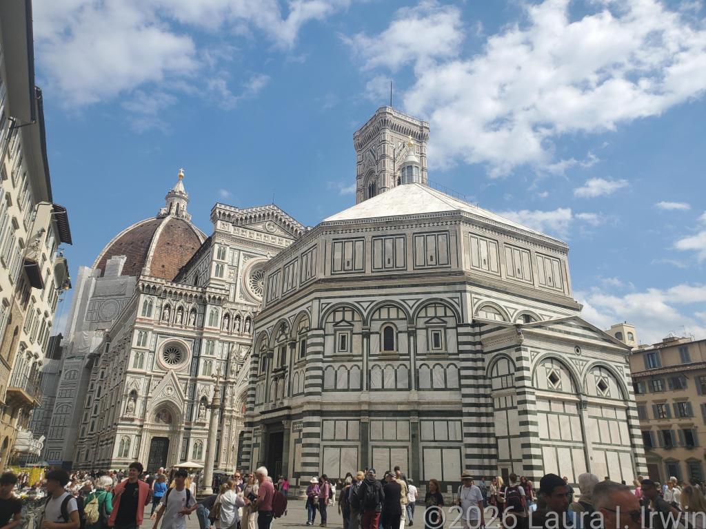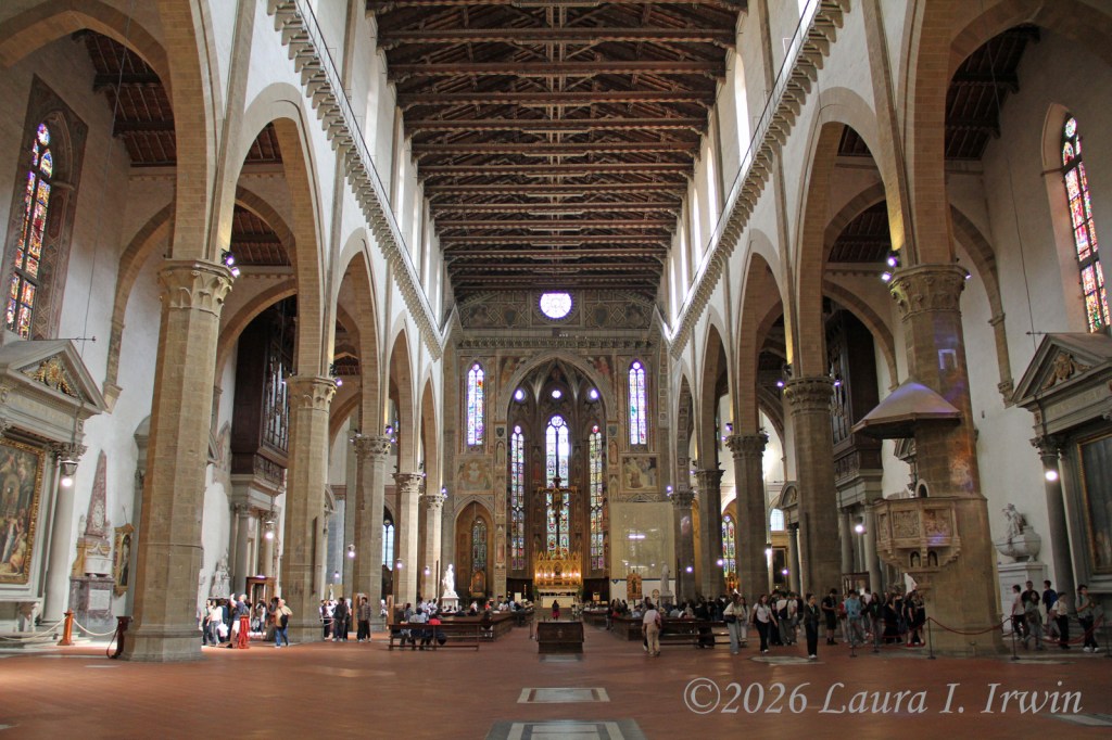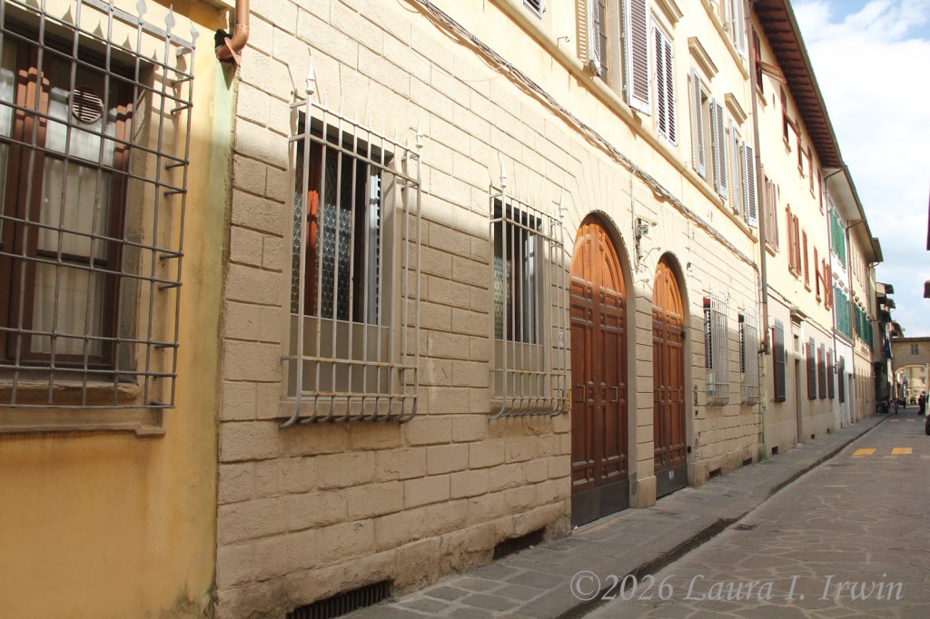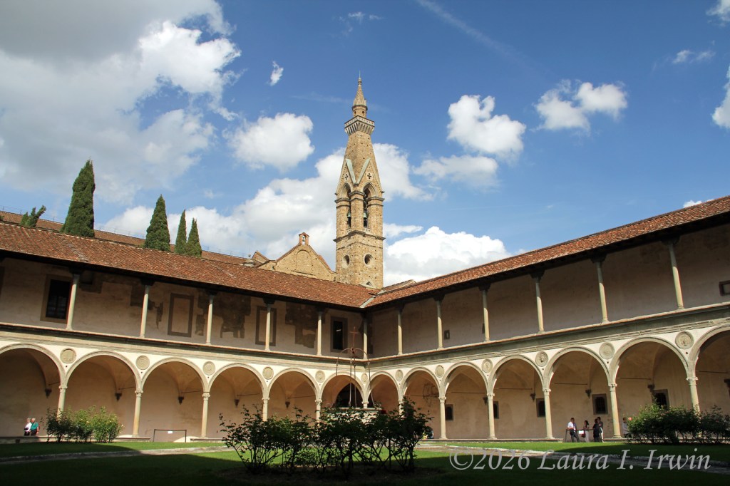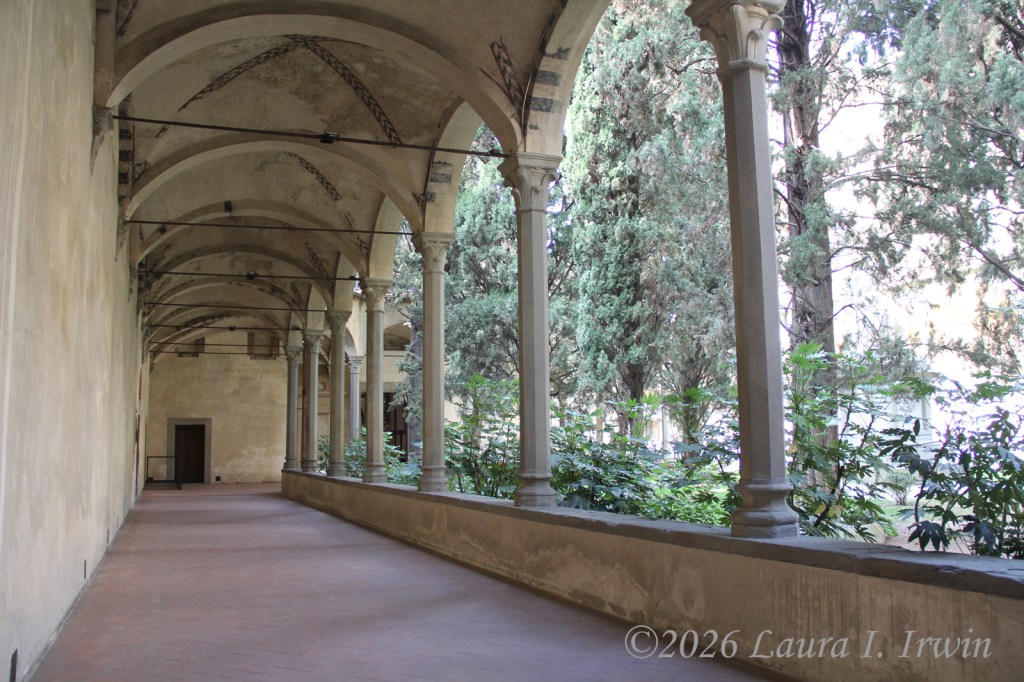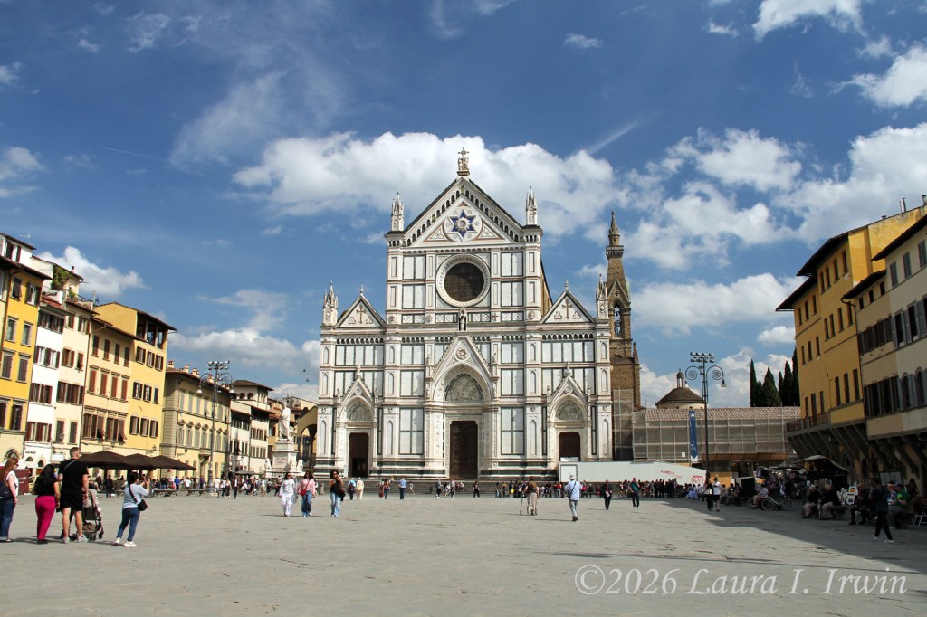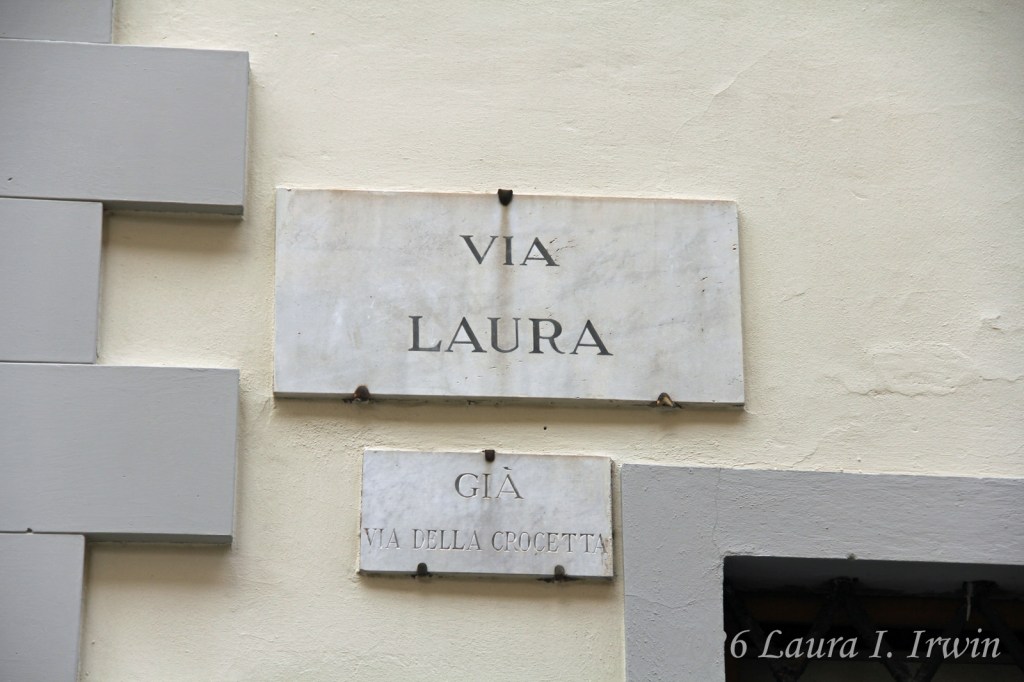 I stopped to grab lunch at the corner snack bar near my hotel and brought my prosciutto and mozzarella panini back to my room to eat on the balcony. After lunch, I decided a nap was in order so I slept away part of the afternoon. Feeling somewhat refreshed, I headed out to explore more of Florence. I had hoped to visit the Duomo, but the line was long and I wasn’t in the mood to wait. Instead, I walked to Via Laura and strolled down the street that bears my name. Then it was on to Basilica di Santa Croce, the final resting place of both Galileo and Michelangelo. I enjoyed walking around the church itself as well as the two cloisters.