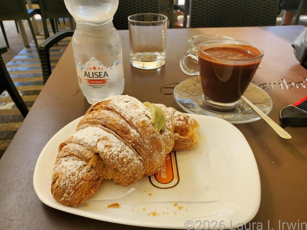 Back in the lower town, I found a patio table at Caffé Garibaldi for a pistachio cream-filled croissant and a hot chocolate (the thick Italian kind; like drinking chocolate pudding!). I checked the bus timetable and realized if I ate quickly, I could catch the 11:11AM bus back to Florence.