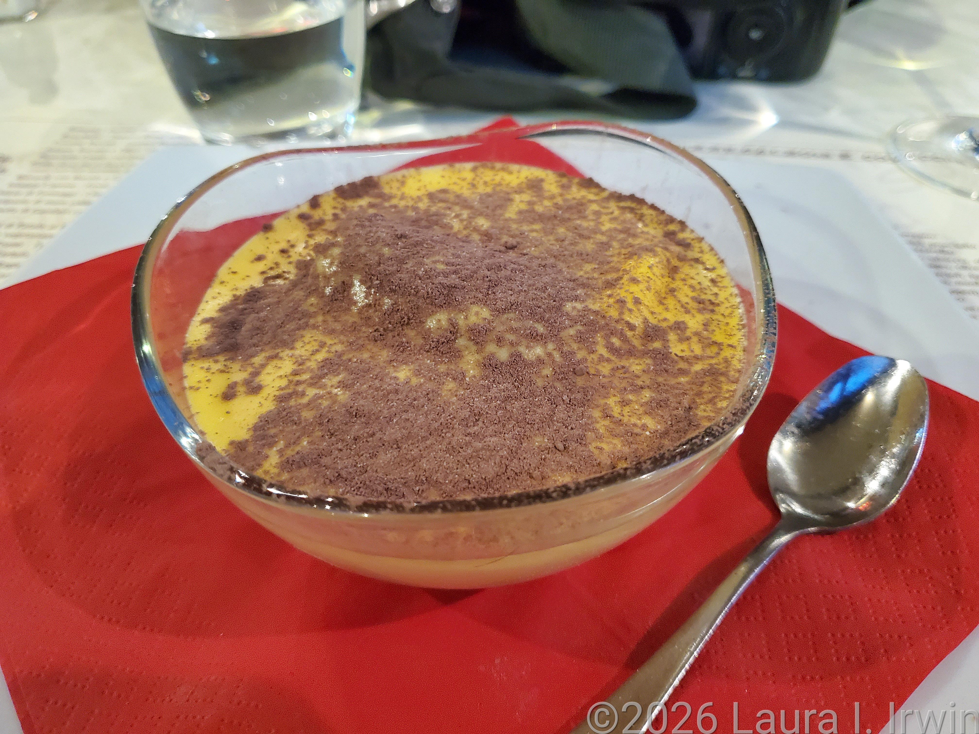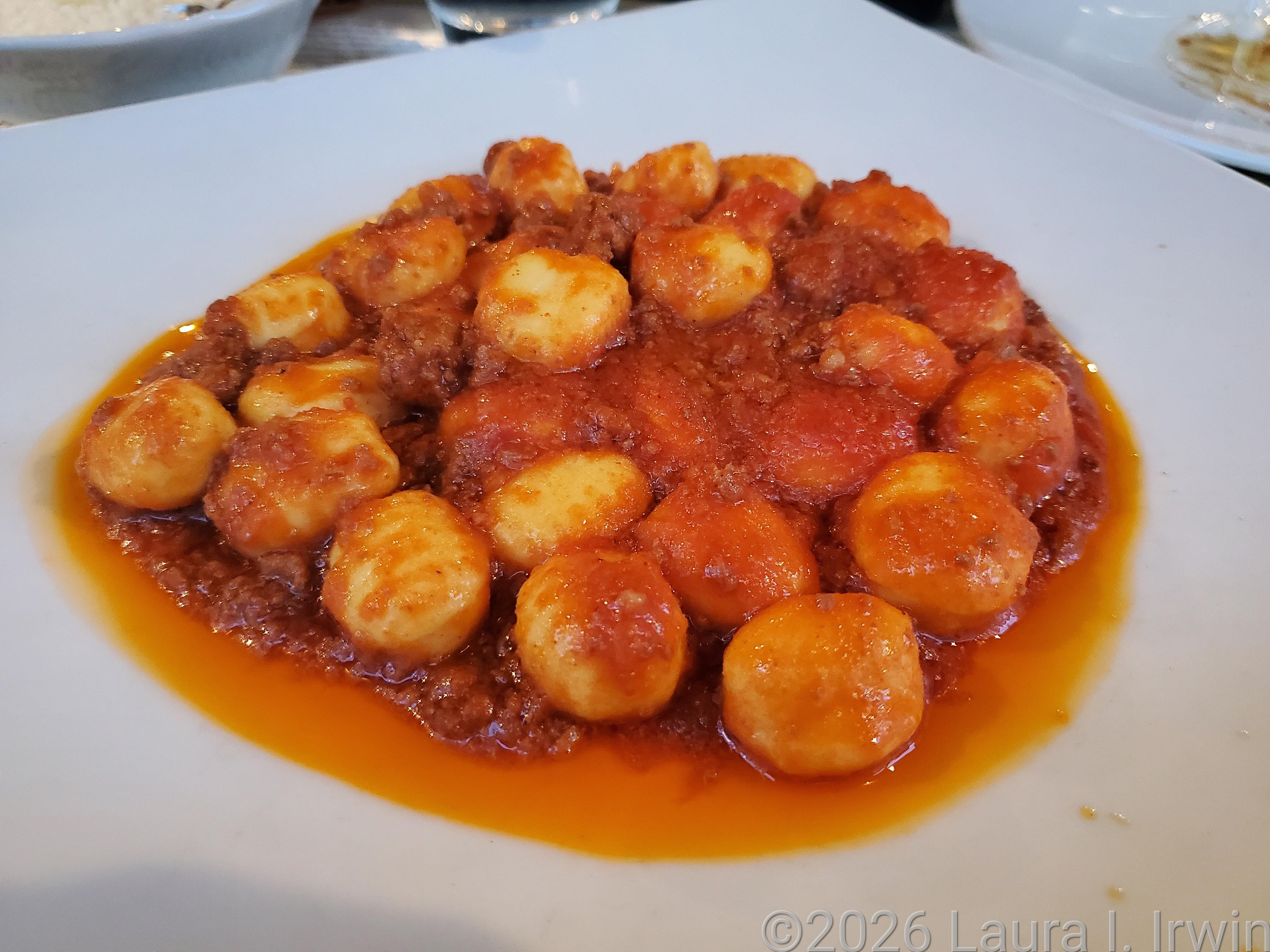 I stopped at a pastry shop I had read about online (Forno Ghibellina) to get a pastry to have for breakfast in the morning and then wandered my way back to my hotel. The restaurant I was planning to eat dinner at didn’t open until 7:15PM.and when I arrived at 6:55PM, there was a line around the corner and down the block. I waited until 7:30, but it was obvious I would need to wait a while if I wanted to eat there. Plan B was to just wander and find a place to eat. I ended up at Ristorante Pizzeria Masò, a place I had walked by several times in the past coupIe of days. I got a table on the covered patio and enjoyed a delicious meal of gnocchi with bolognese sauce, a glass of prosecco, and tiramisu to end the day.