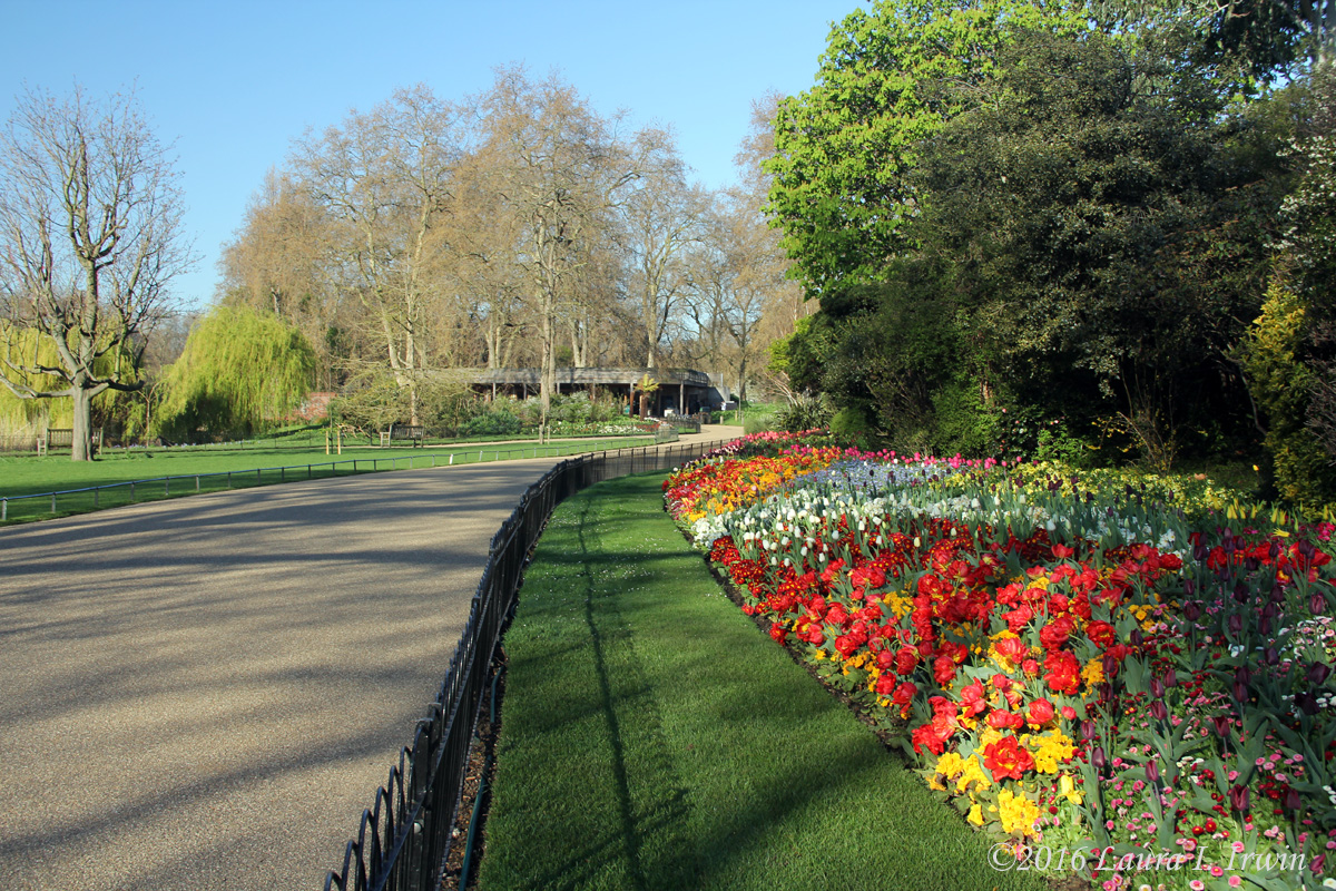 Despite the 5 hour time change and jet lag, I woke up promptly at 5:15 AM (which happens about 360 days a year). Breakfast didn’t start until 7, so I had some time to ease into the day. After breakfast, I was out the door for a Sunday morning walk. I meandered my way through back streets in the general direction of St. James’s Park. Almost all of the flowers in the park were in full bloom. I walked through the park towards Buckingham Palace. Along the way, I found a group of large pelicans and a family of geese, perfect photographic subjects. As I was walking, I could hear a bass drum occasionally in the distance and decided to find out where it was coming from. I discovered a whole group of what appeared to be “guards in training” going through training exercises across the street from the park. Pretty impressive to watch!